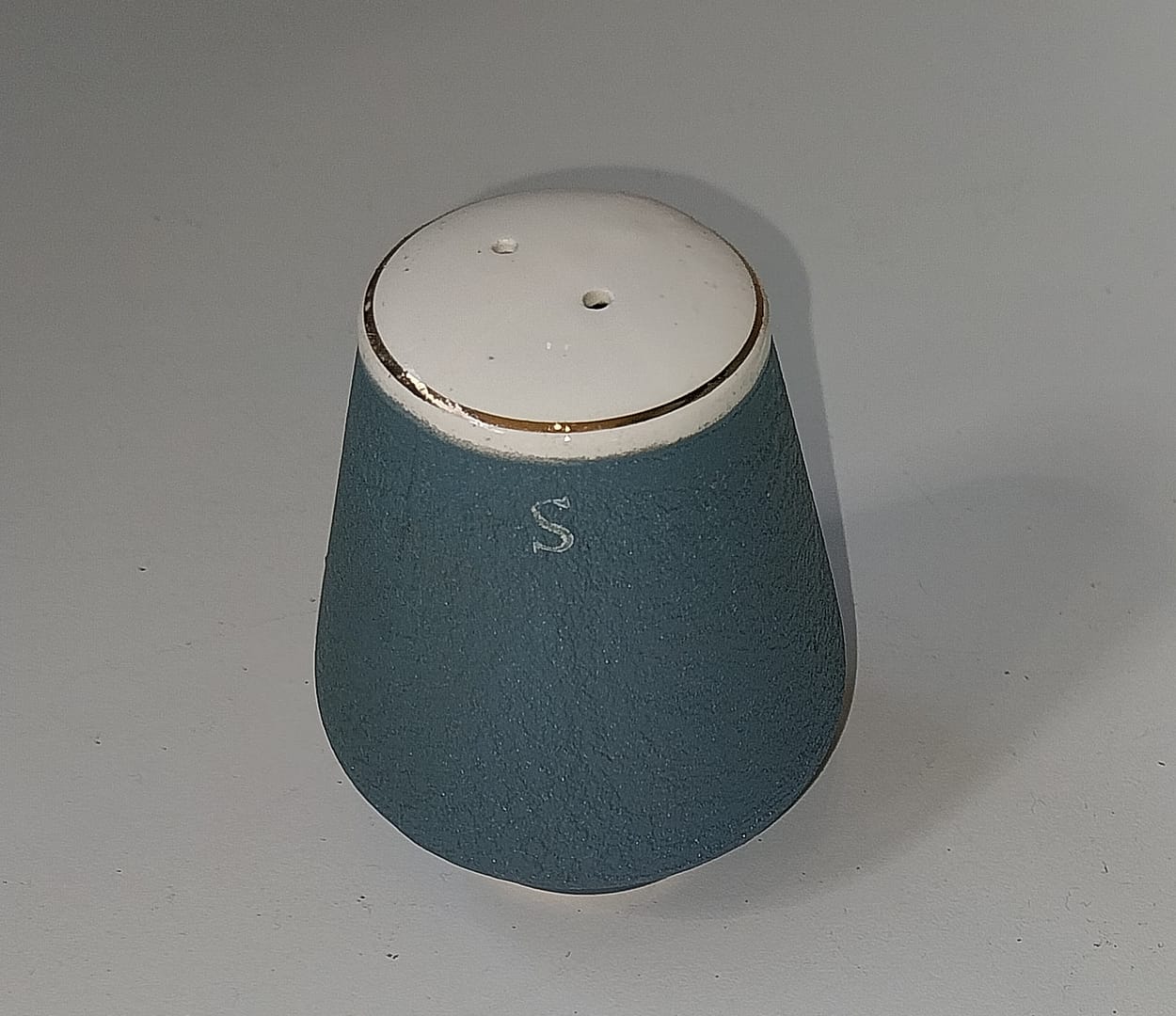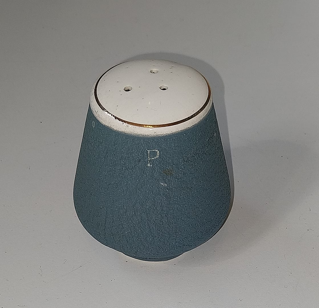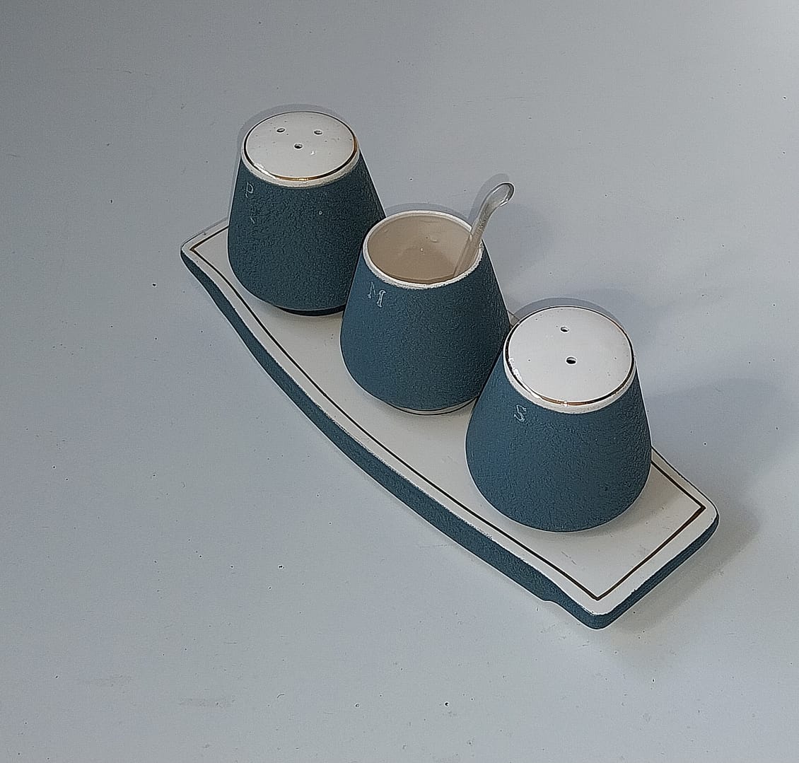 Keramisch peper- en zoutstel met een mosterdpotje op een bijbehorend schaaltje. Het mid-century ontwerp is uitgevoerd in een mat blauw (vaak “Pacific Blue” genoemd) met witte accenten en gouden randjes.
