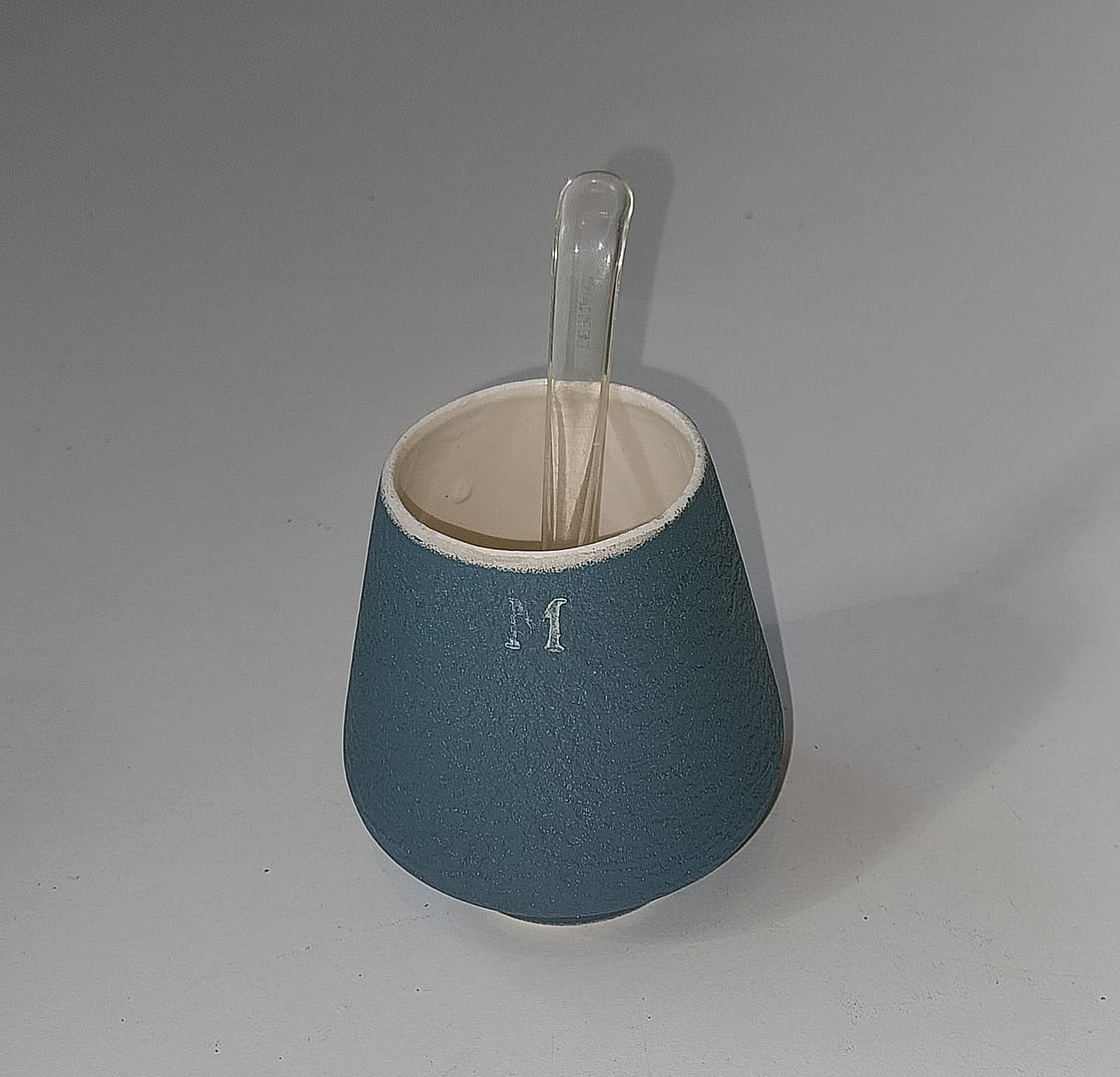 - Keramiek met een matte textuur, afgewerkt met gouden biezen en witte strooikoppen.