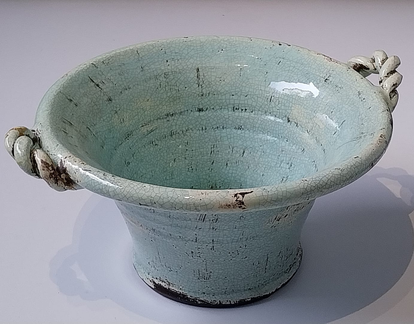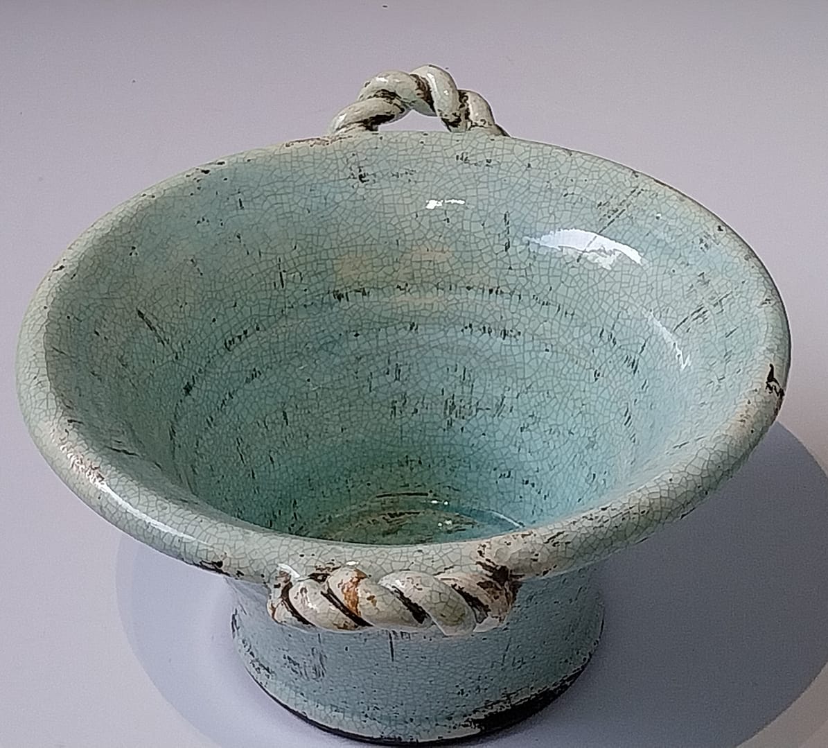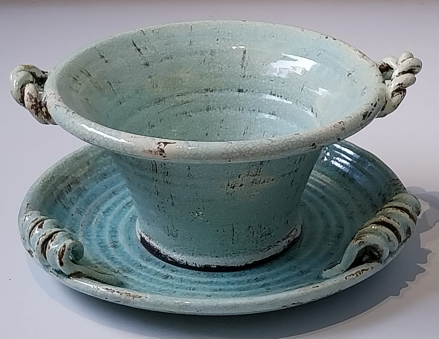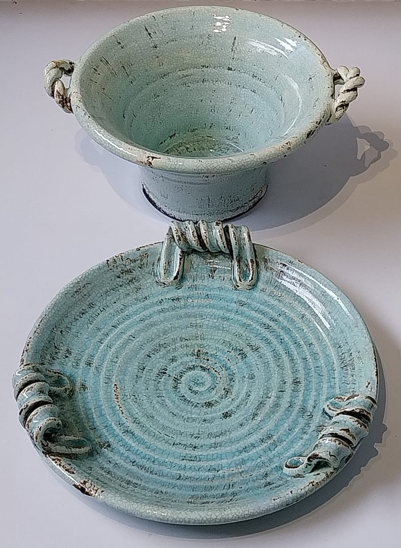 - Zowel de schaal als de kom zijn voorzien van decoratieve handvatten in de vorm van gedraaide touwen.