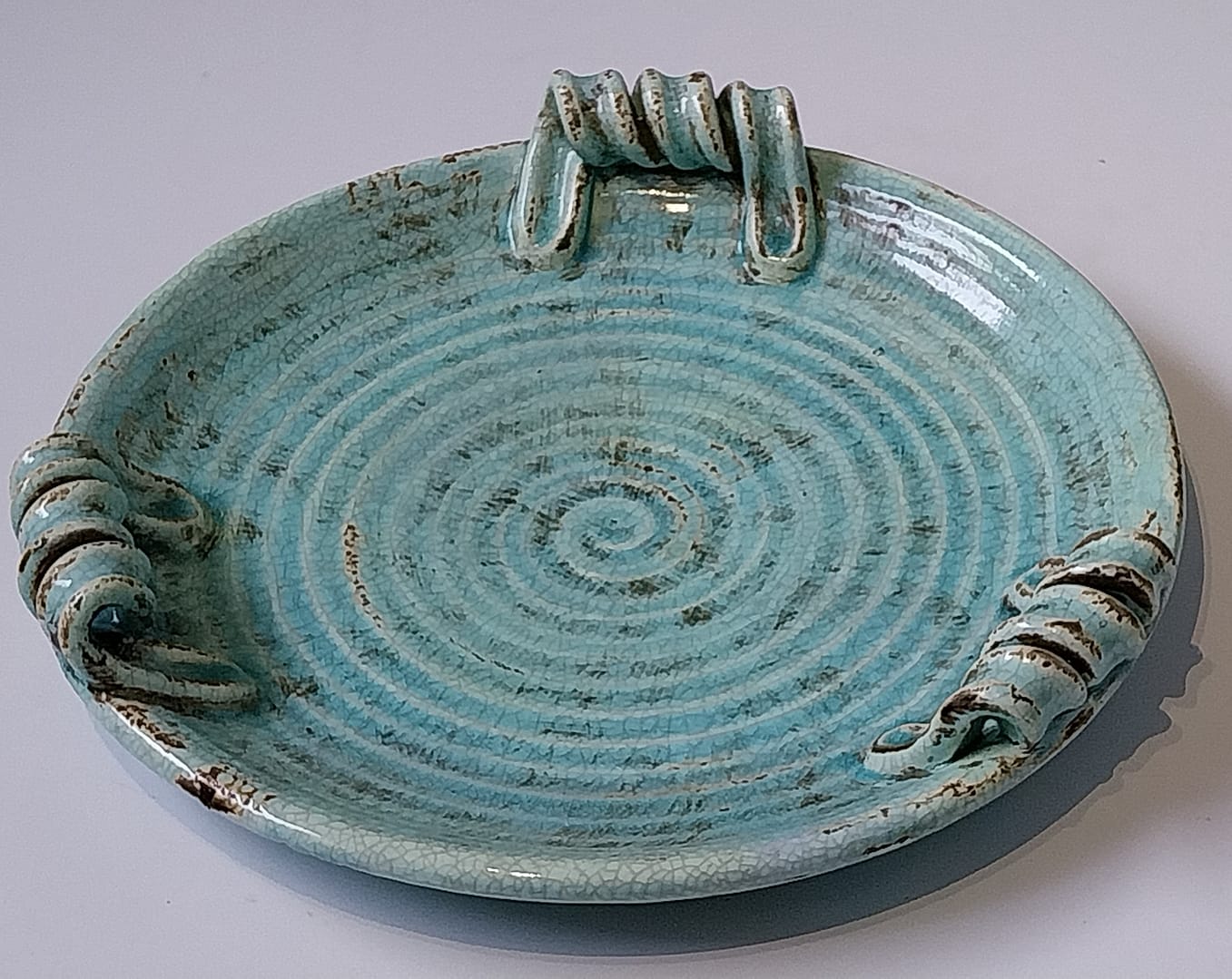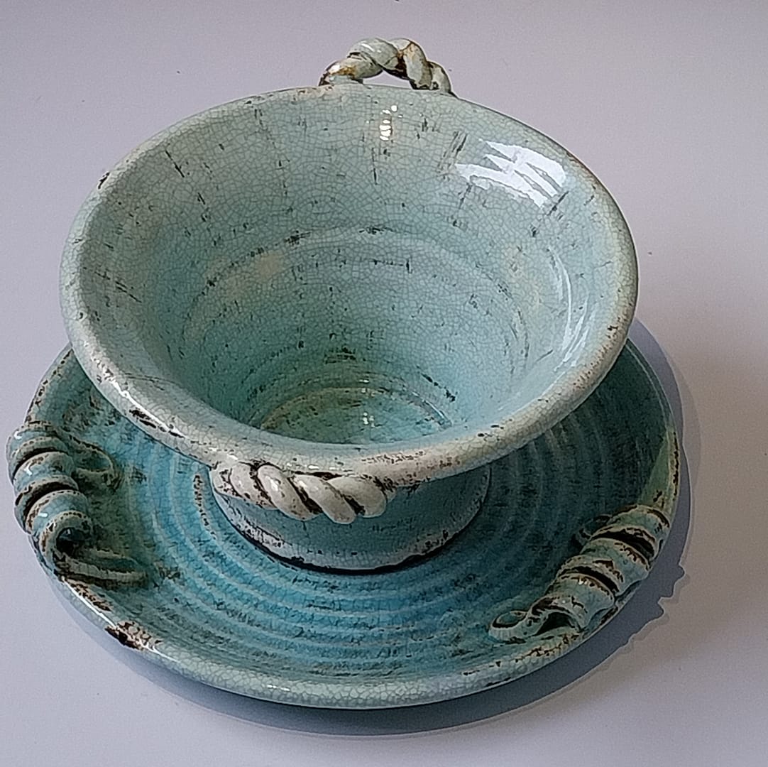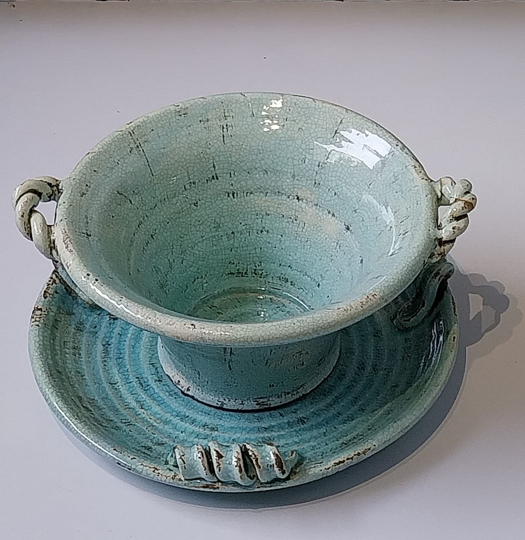 - Zowel de schaal als de kom zijn voorzien van decoratieve handvatten in de vorm van gedraaide touwen.