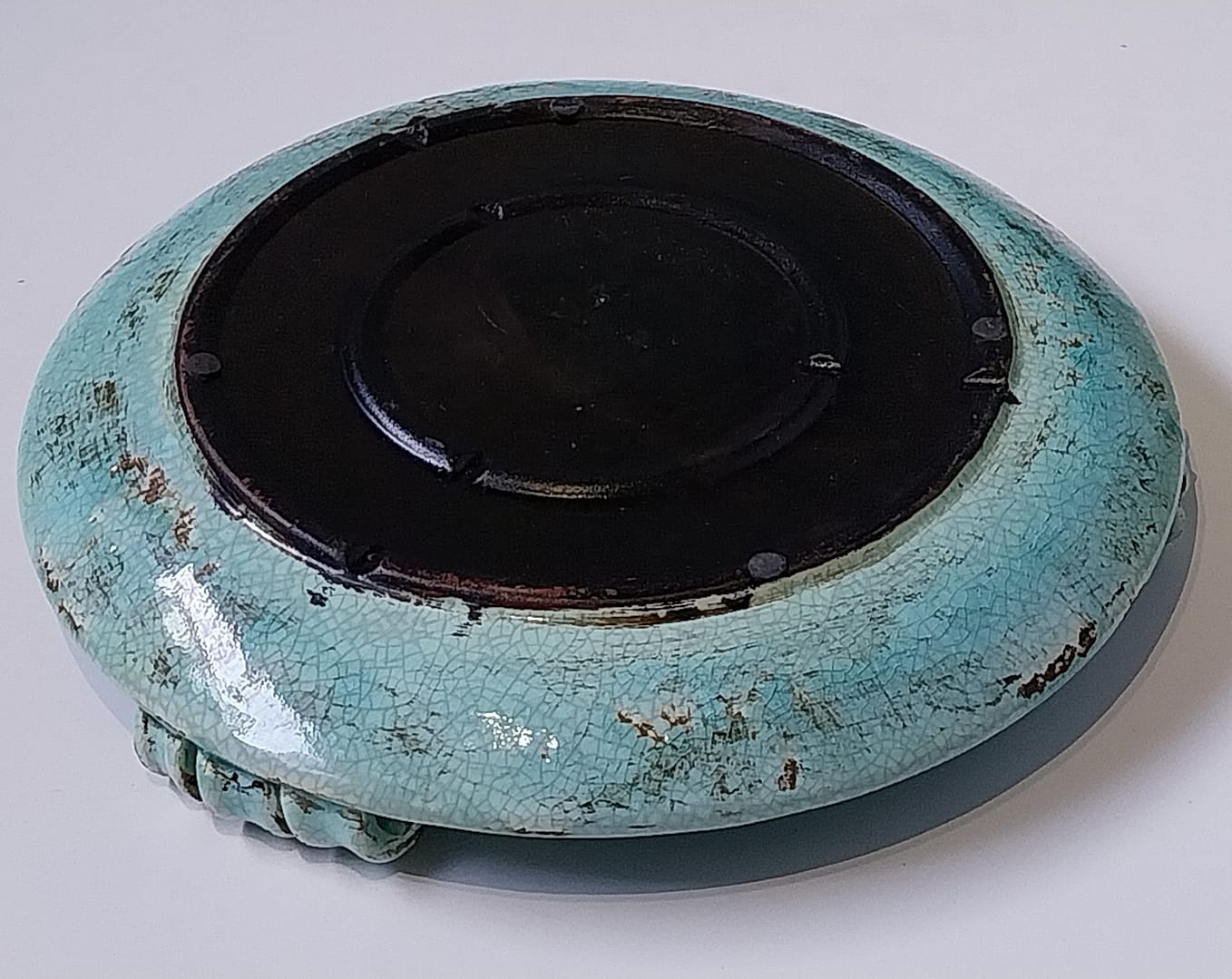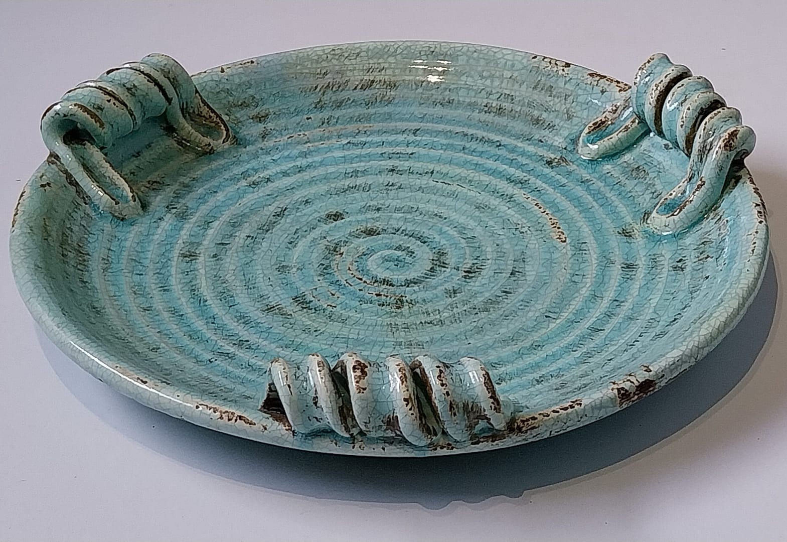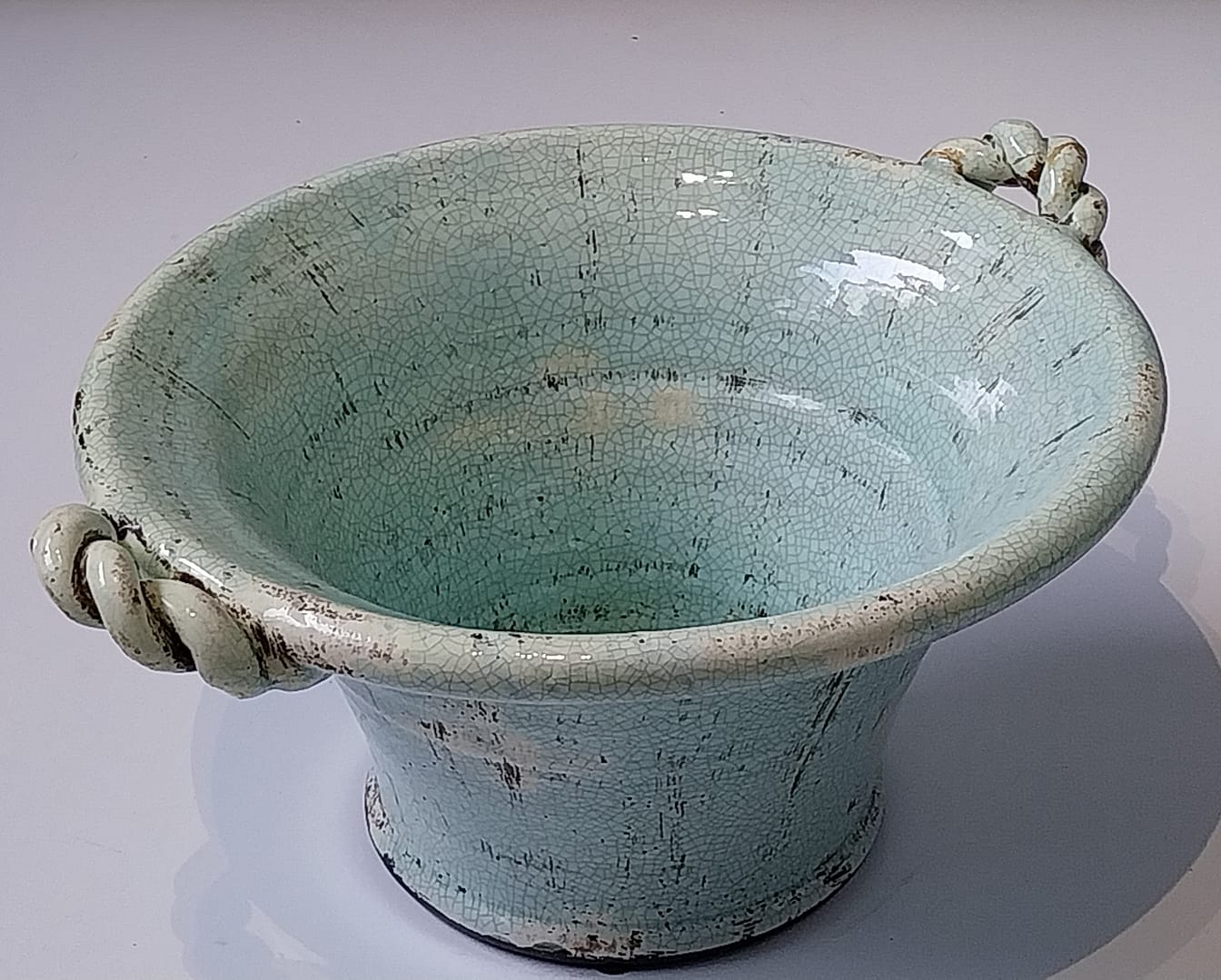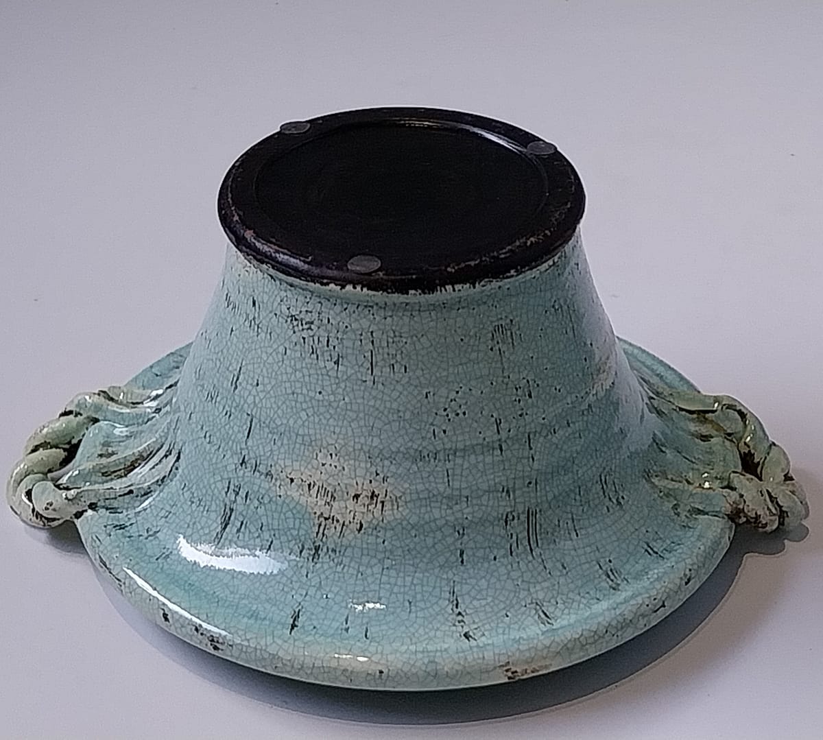 - Zowel de schaal als de kom zijn voorzien van decoratieve handvatten in de vorm van gedraaide touwen.
