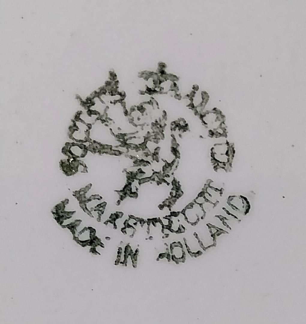 - Het merkteken aan de onderzijde toont een gekroonde leeuw, omringd door de tekst “SOCIÉTÉ CÉRAMIQUE MAESTRICHT MADE IN HOLLAND”. De Société Céramique was een aardewerkfabriek in Maastricht, Nederland. Het bedrijf opereerde van 1863 tot 1958.