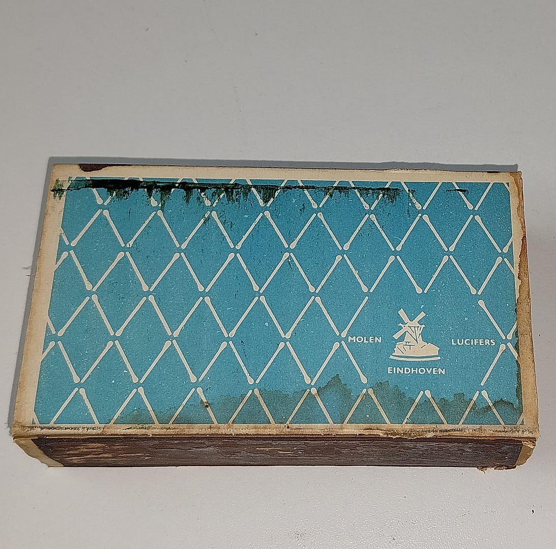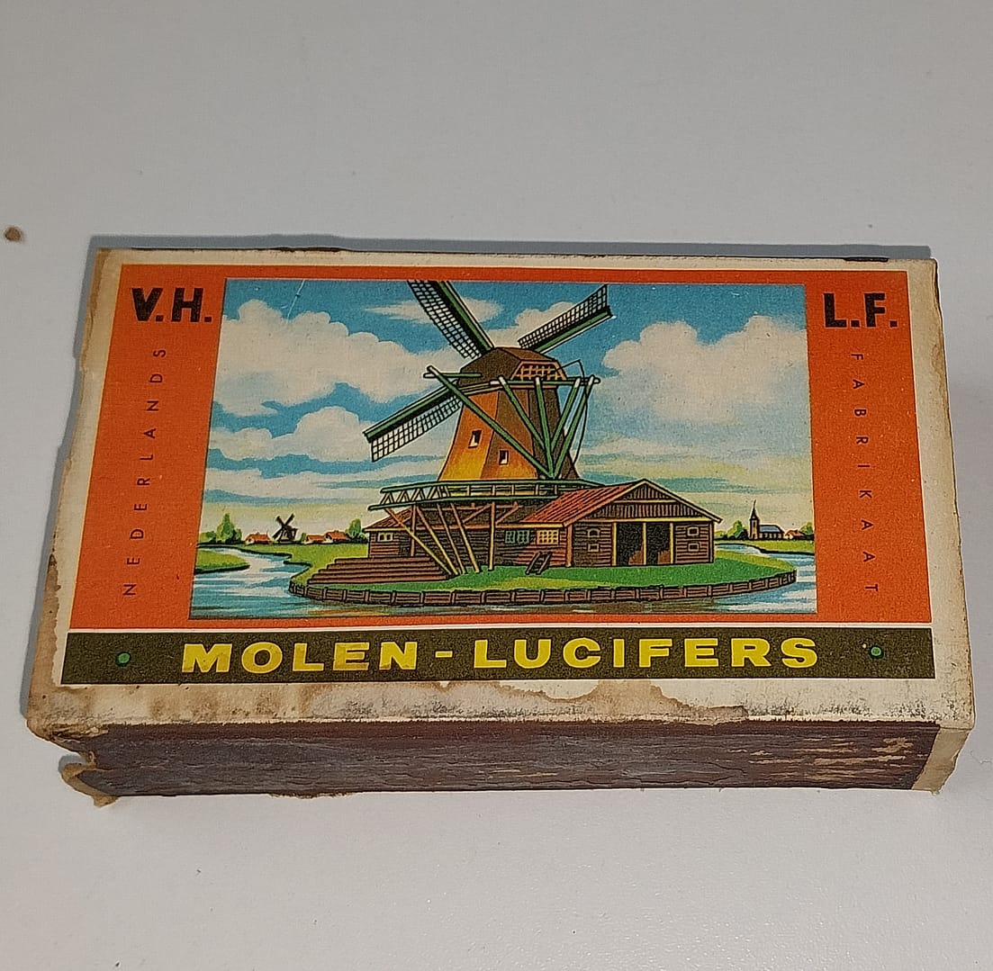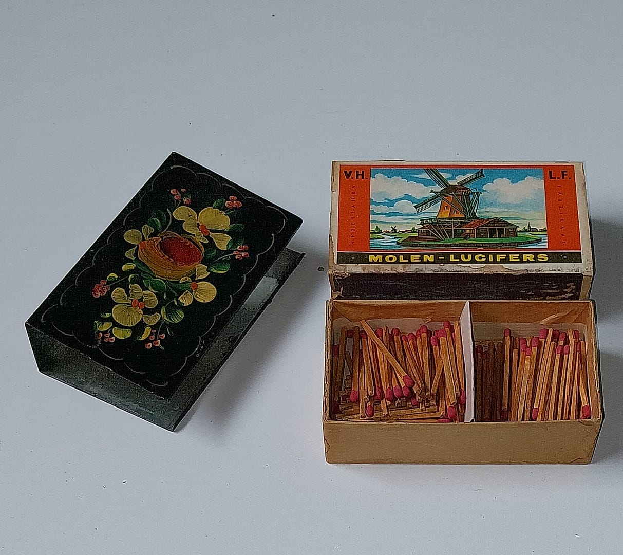 - Prachtige uit de jaren ’50 beschilderde metalen luciferdooshouder met een doos lucifers van het merk “Molen Lucifer, Eindhoven)