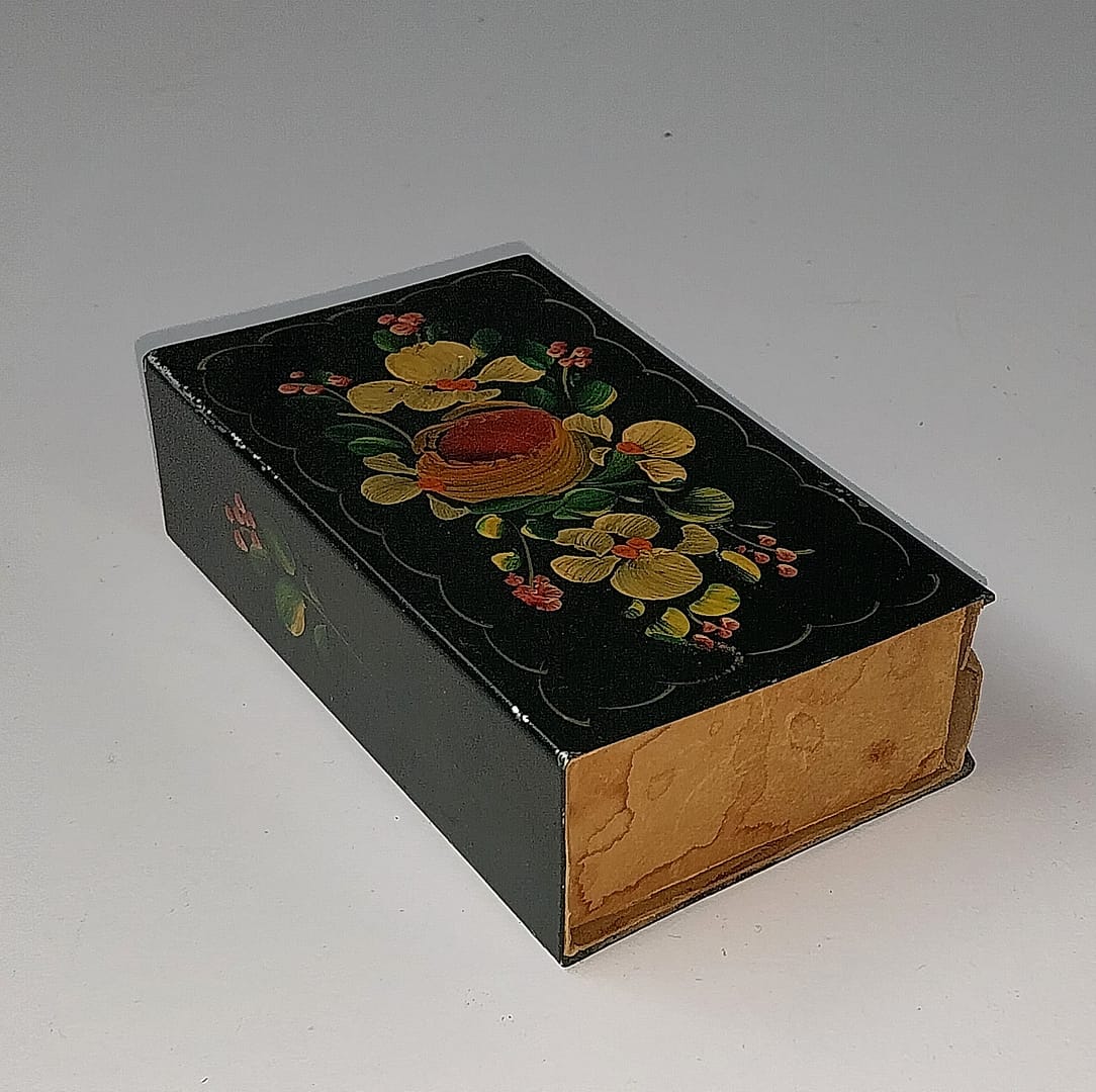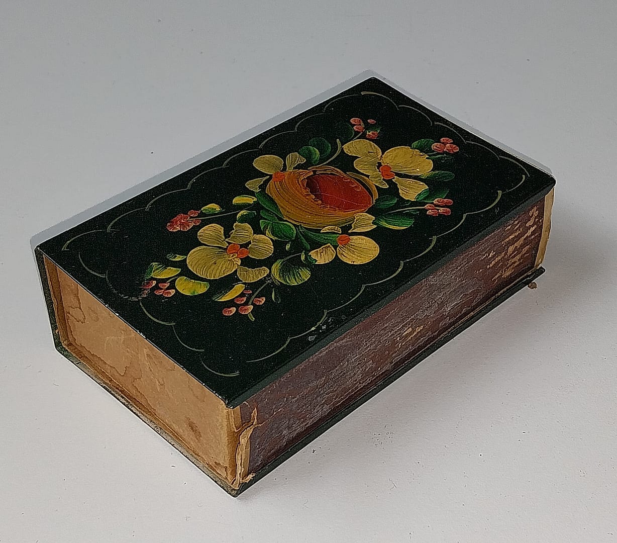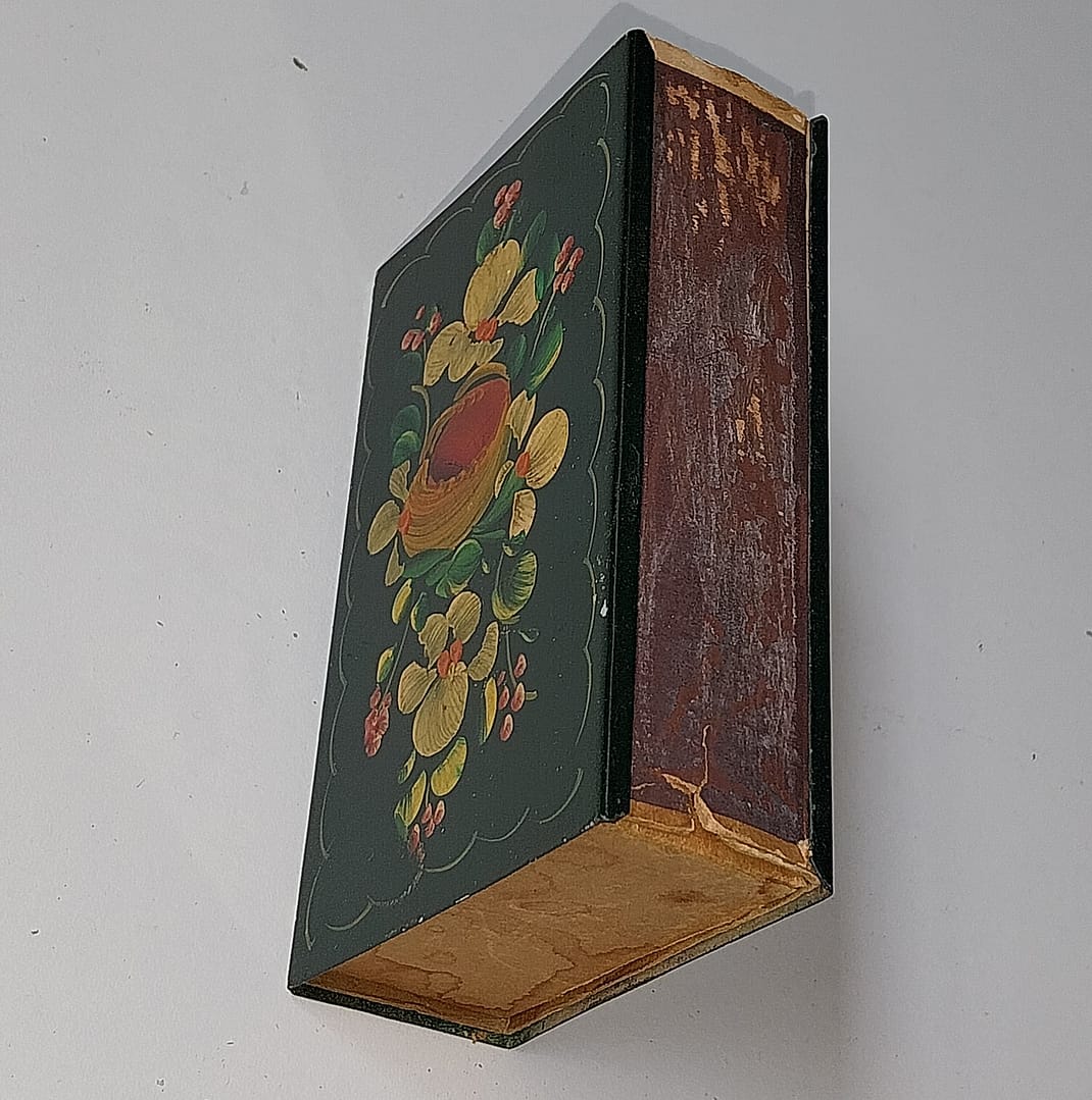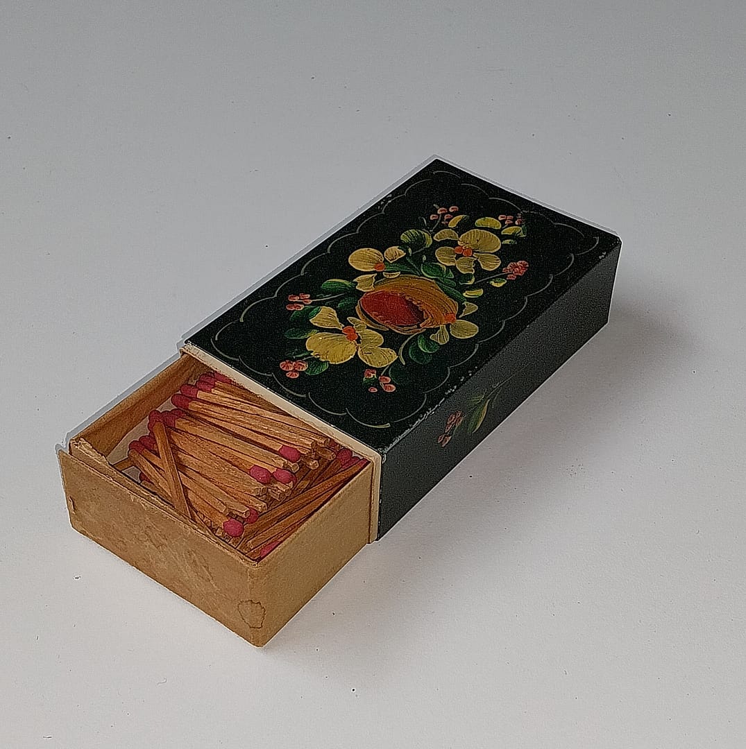 - Prachtige uit de jaren ’50 beschilderde metalen luciferdooshouder met een doos lucifers van het merk “Molen Lucifer, Eindhoven)