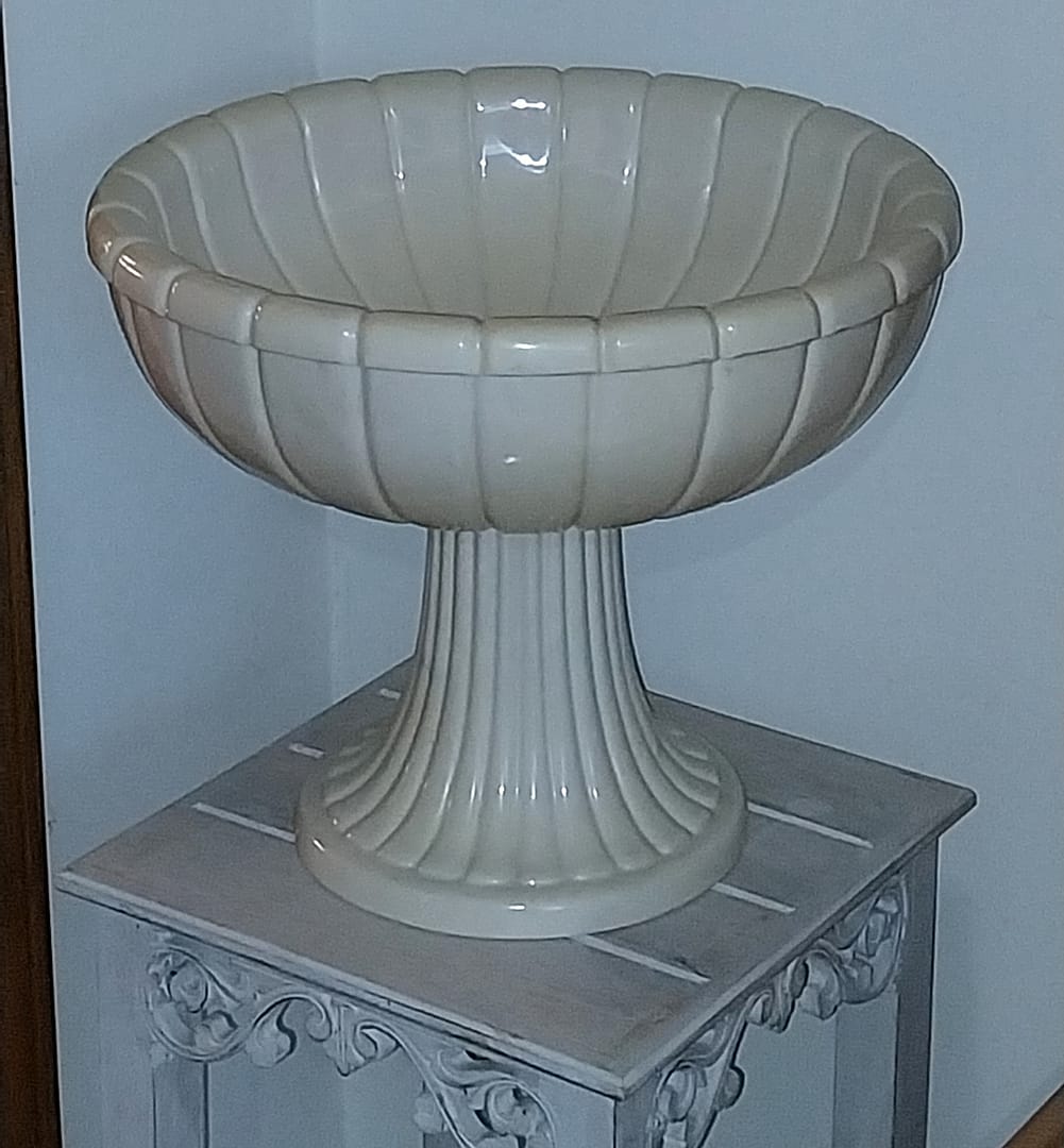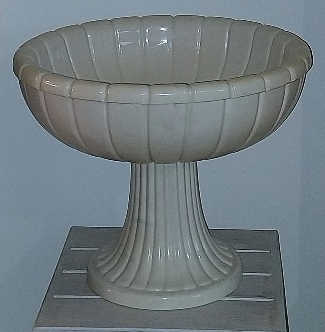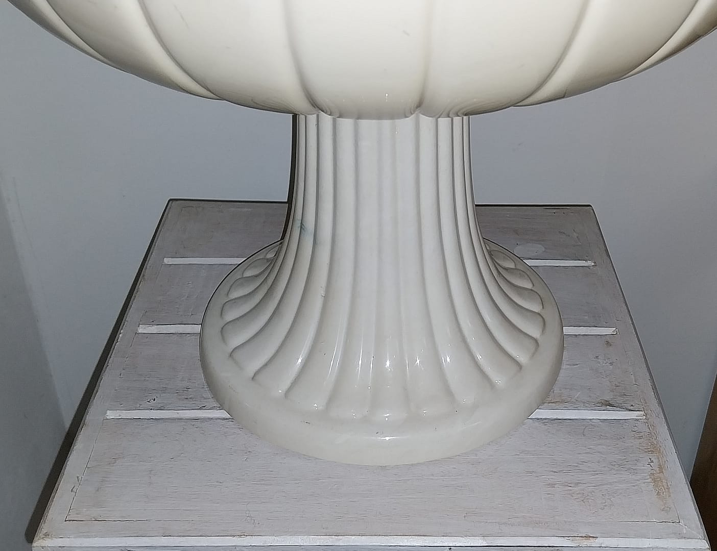 - Dit is een decoratieve urn, vaas, bloempot of schaal op een voet, gemaakt van marmer. Het ontwerp doet denken aan klassieke Griekse of Romeinse stijlen, met een breed geribbelde kom die op een voetstuk staat.