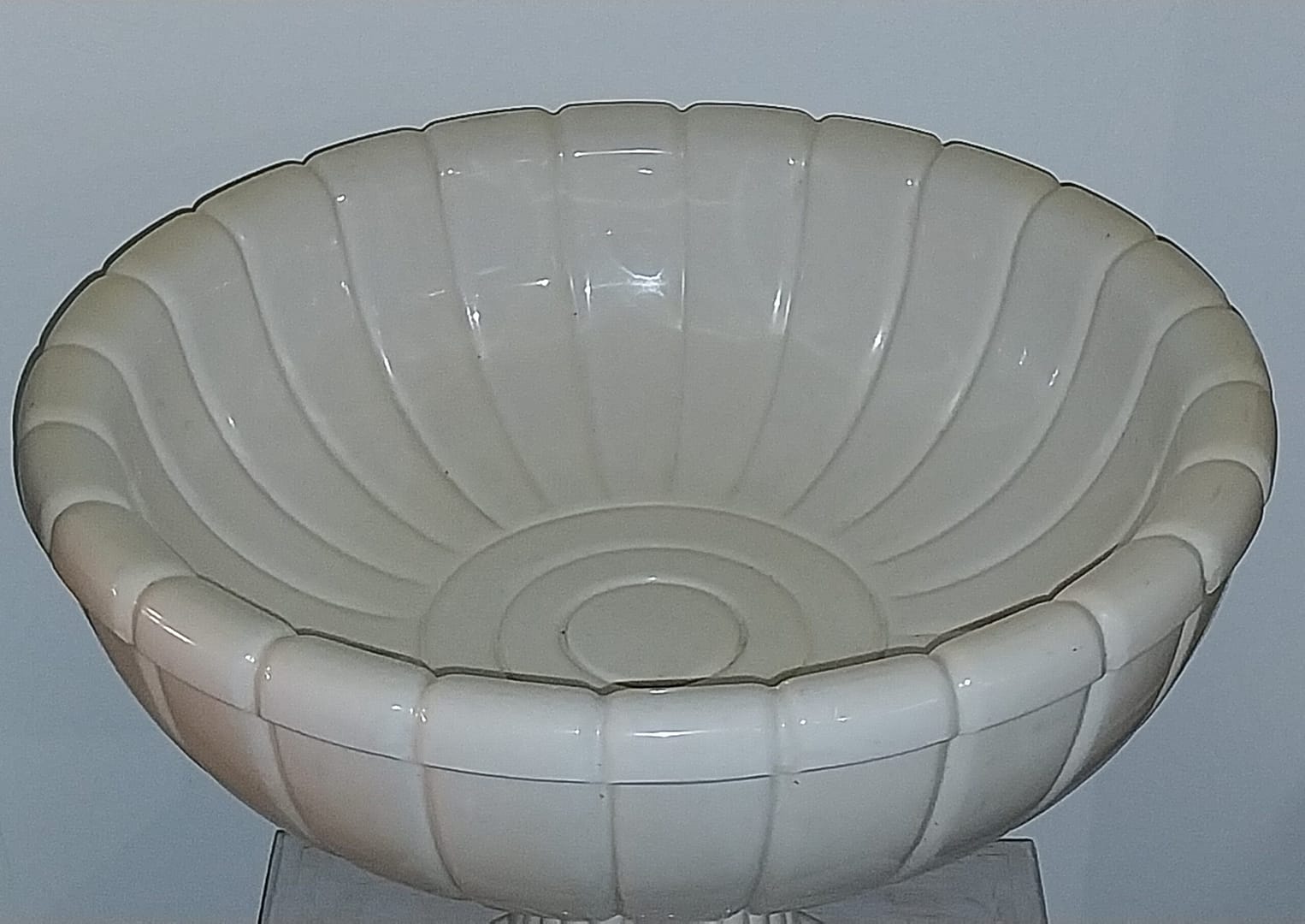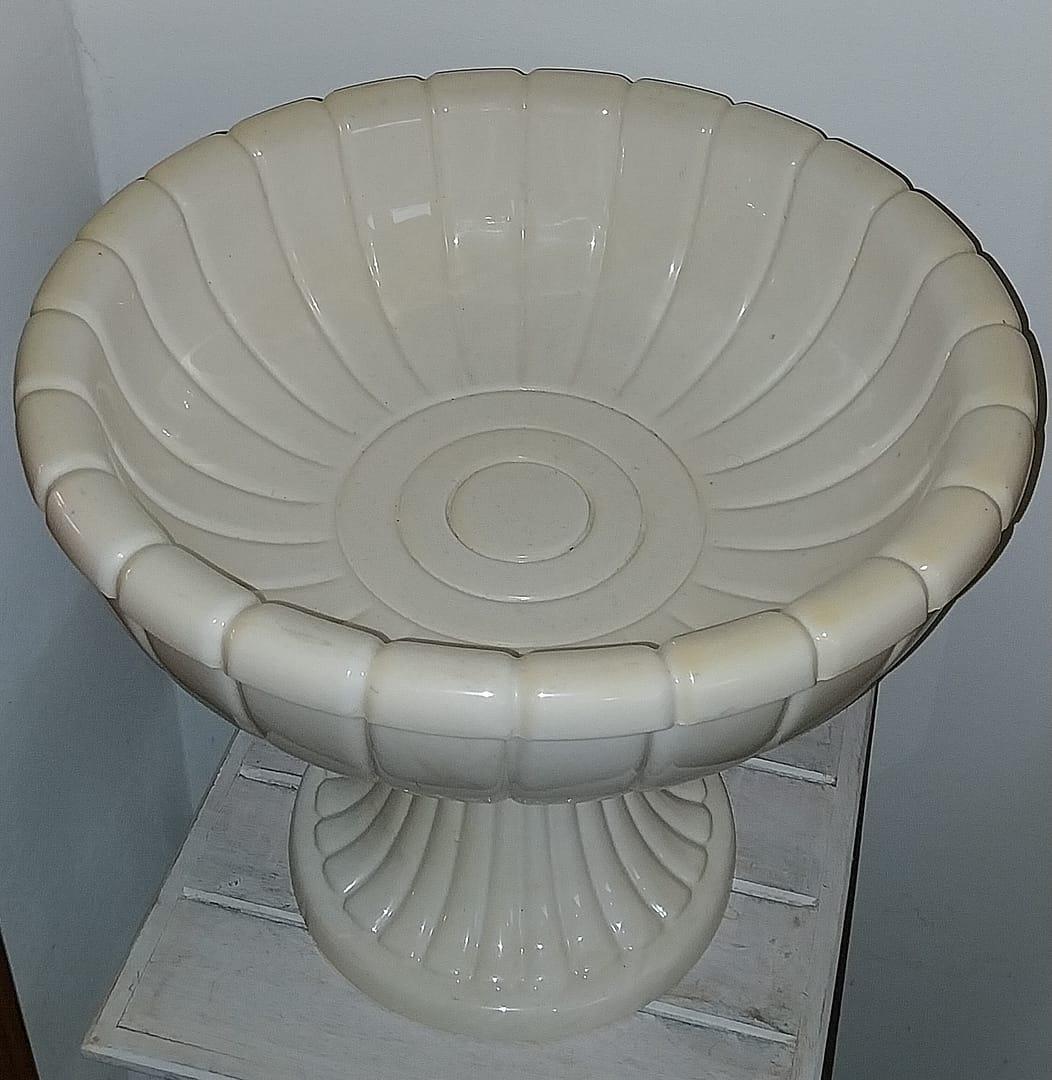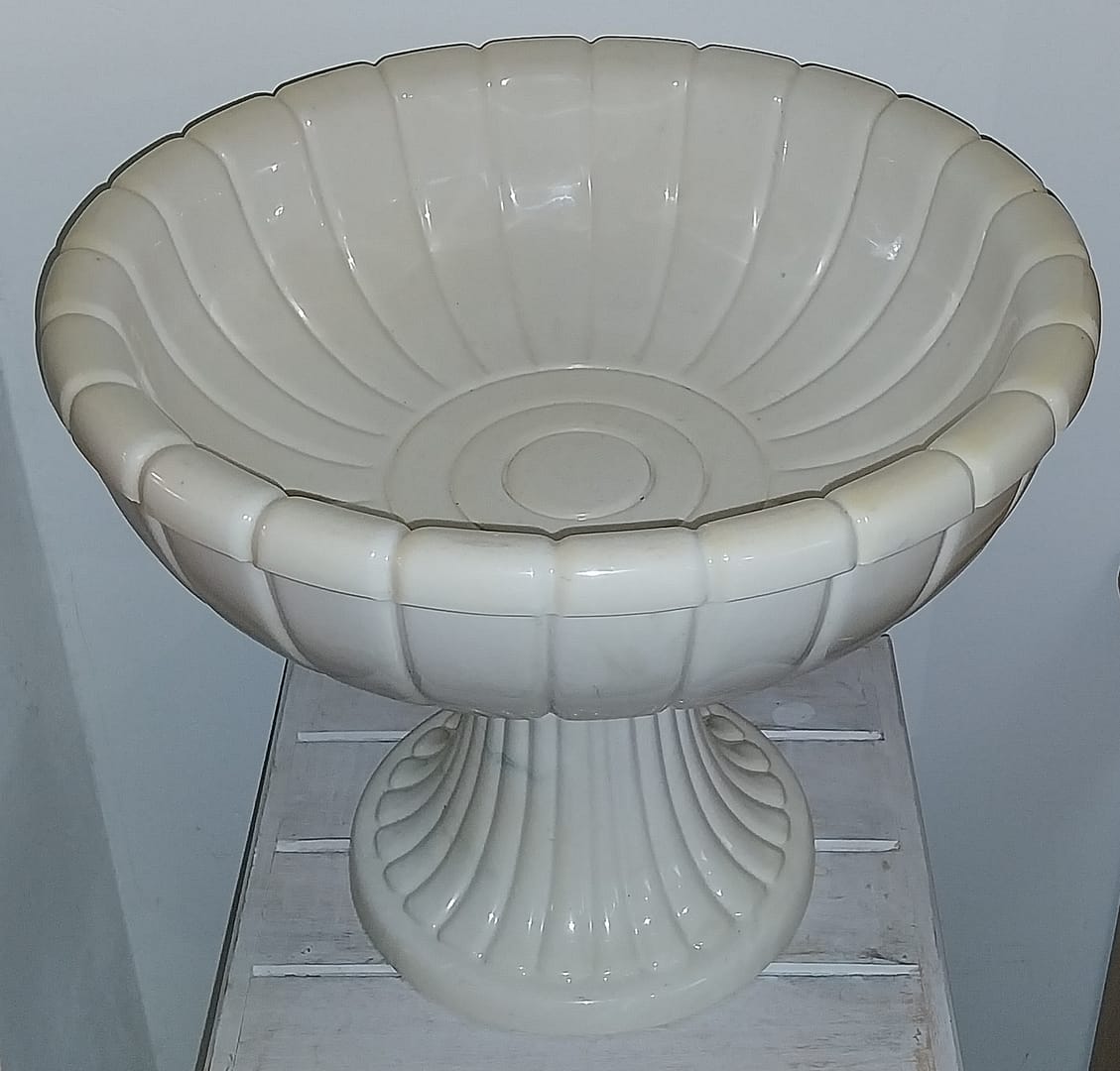 - Dit is een decoratieve urn, vaas, bloempot of schaal op een voet, gemaakt van marmer. Het ontwerp doet denken aan klassieke Griekse of Romeinse stijlen, met een breed geribbelde kom die op een voetstuk staat.