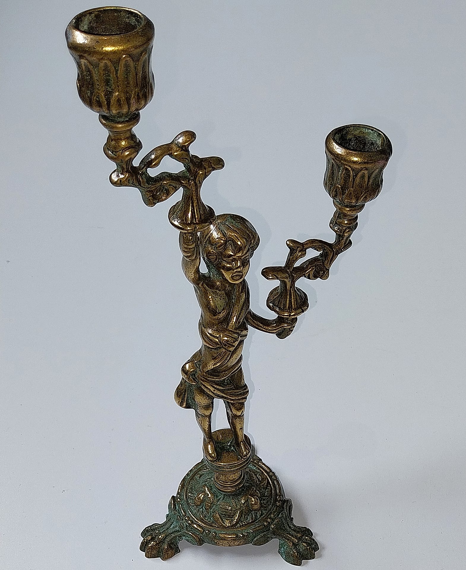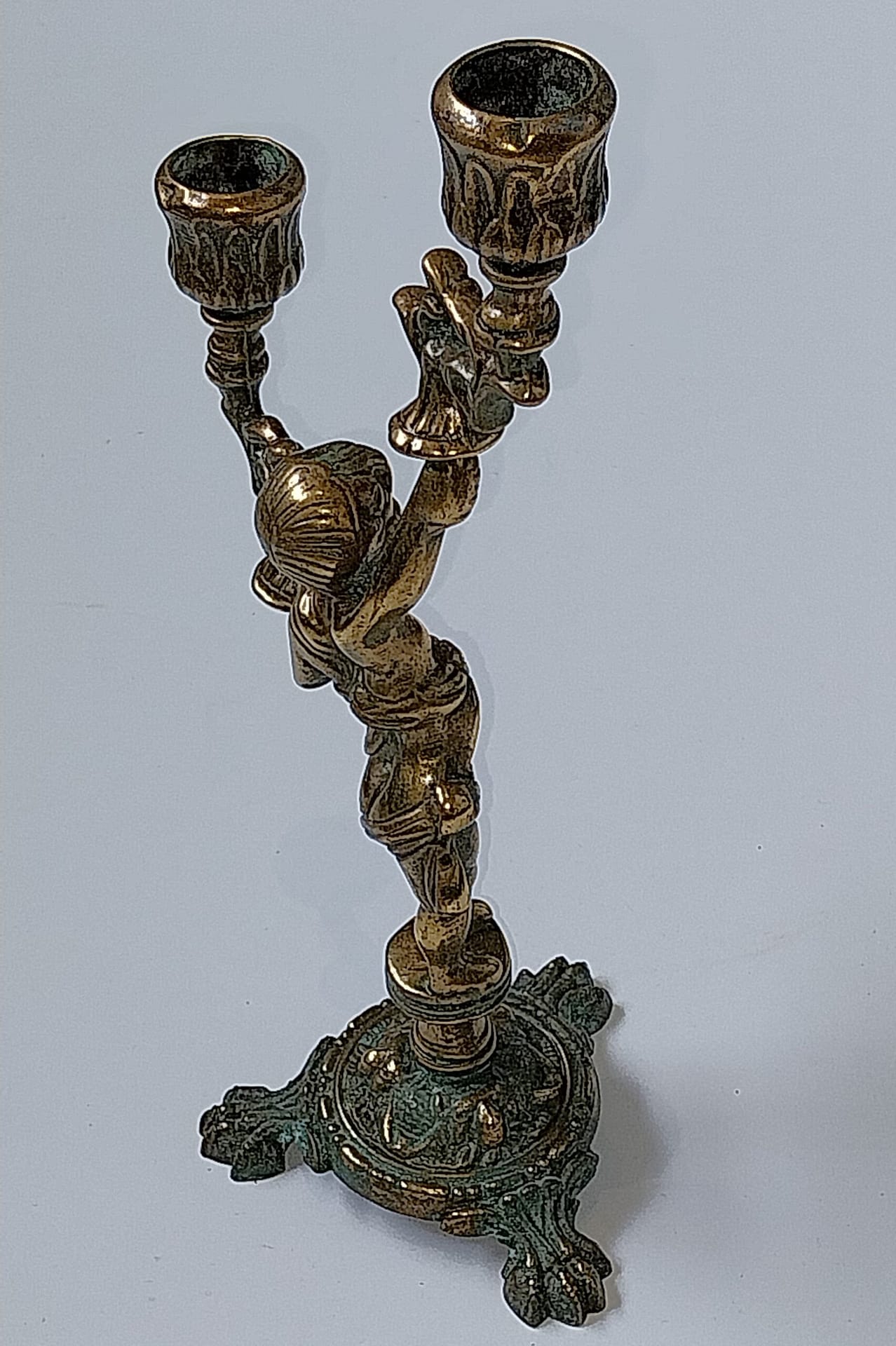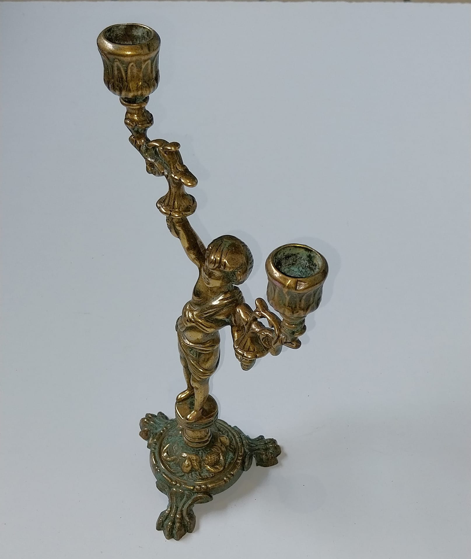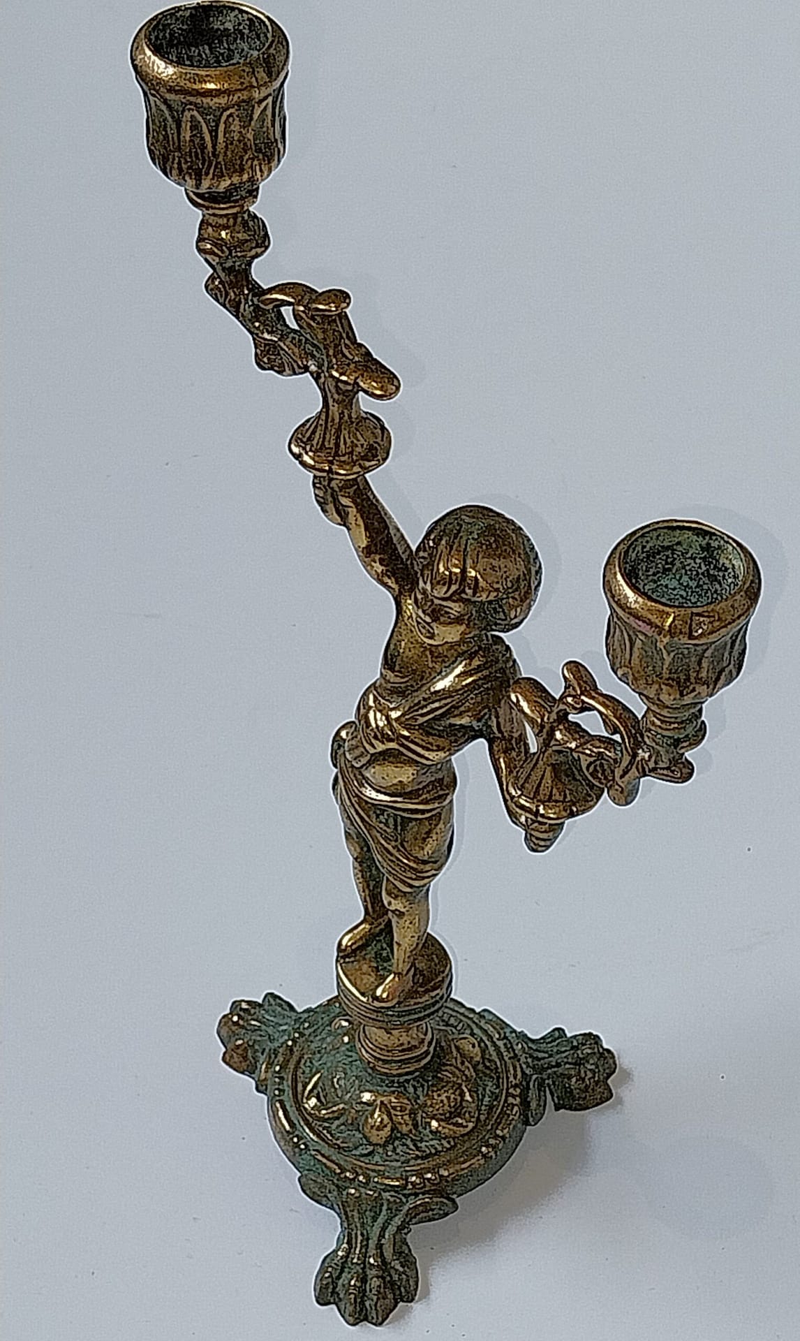 - Messing kandelaar met Engel, twee gebogen armen en het subtiel verouderde patina verwijzen naar een tijd waarin zelfs alledaagse voorwerpen artistiek en zwaar ( 1,2 kg) werden ontworpen. In goede staat met lichte slijtage aan het oppervlak in overeenstemming met de leeftijd. Deze kandelaar dateert van rond 1920.