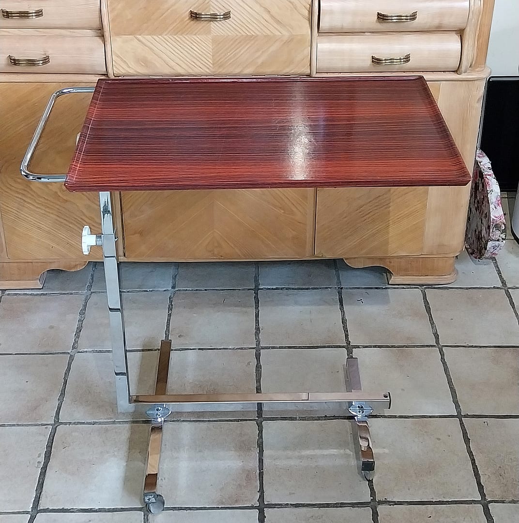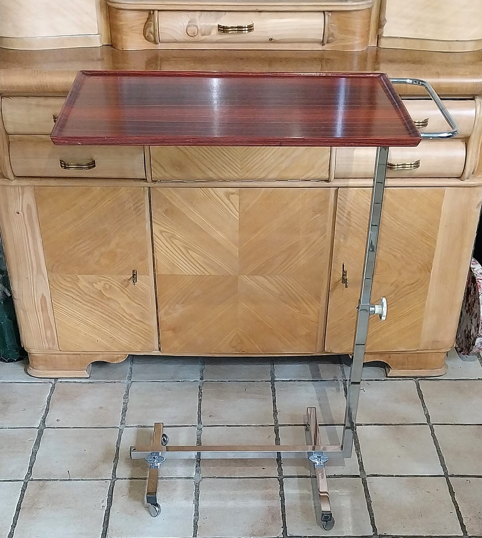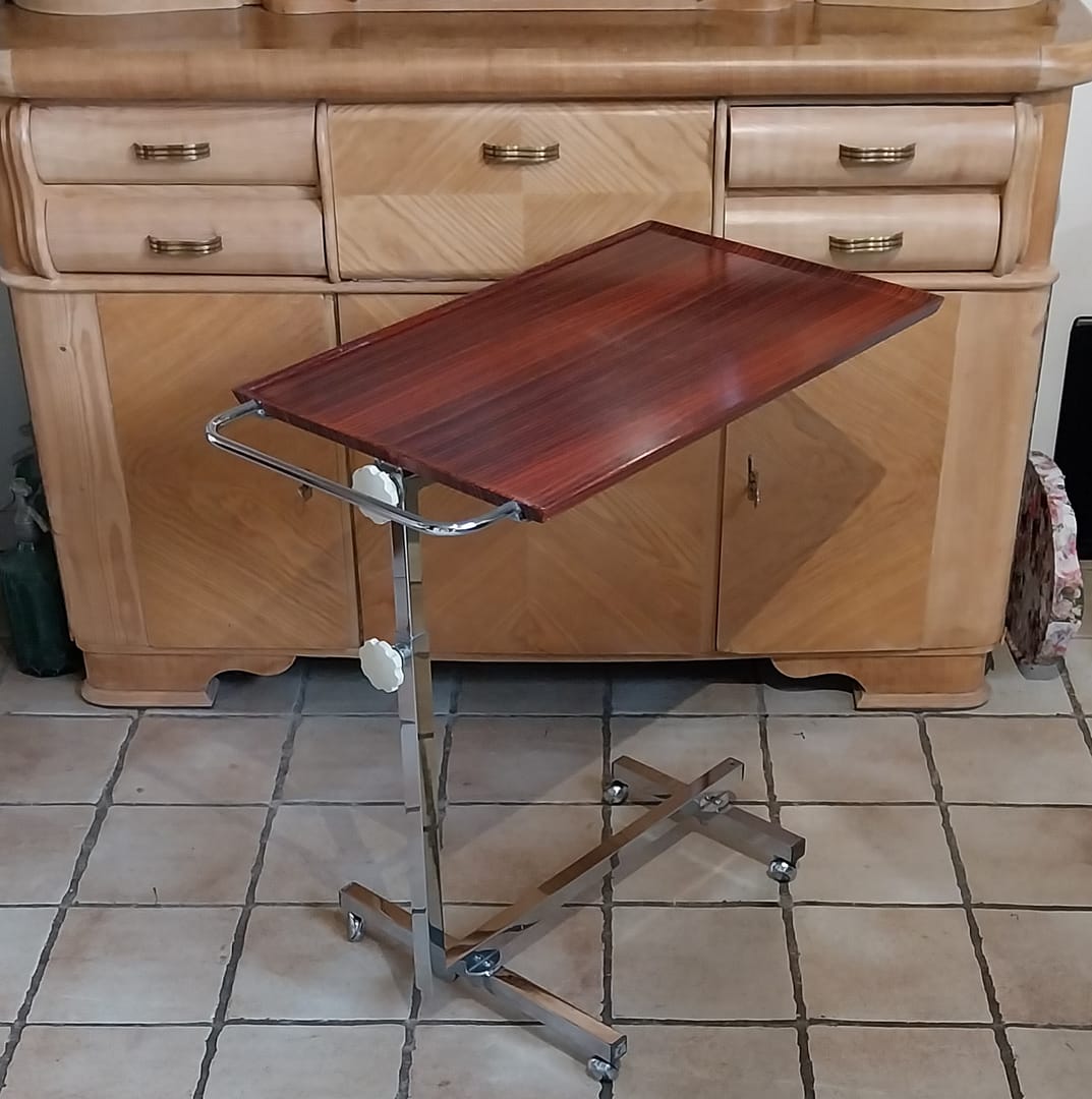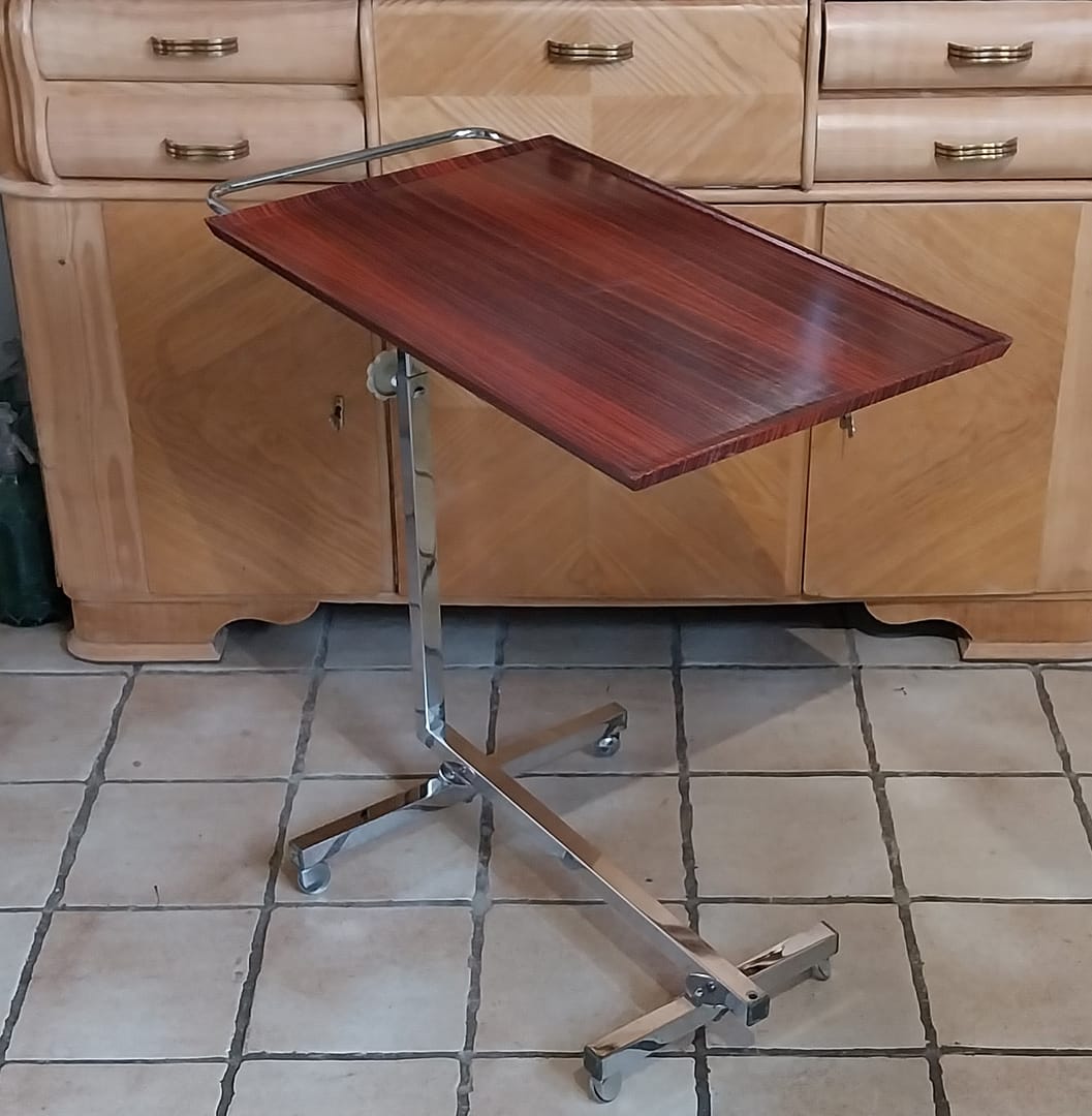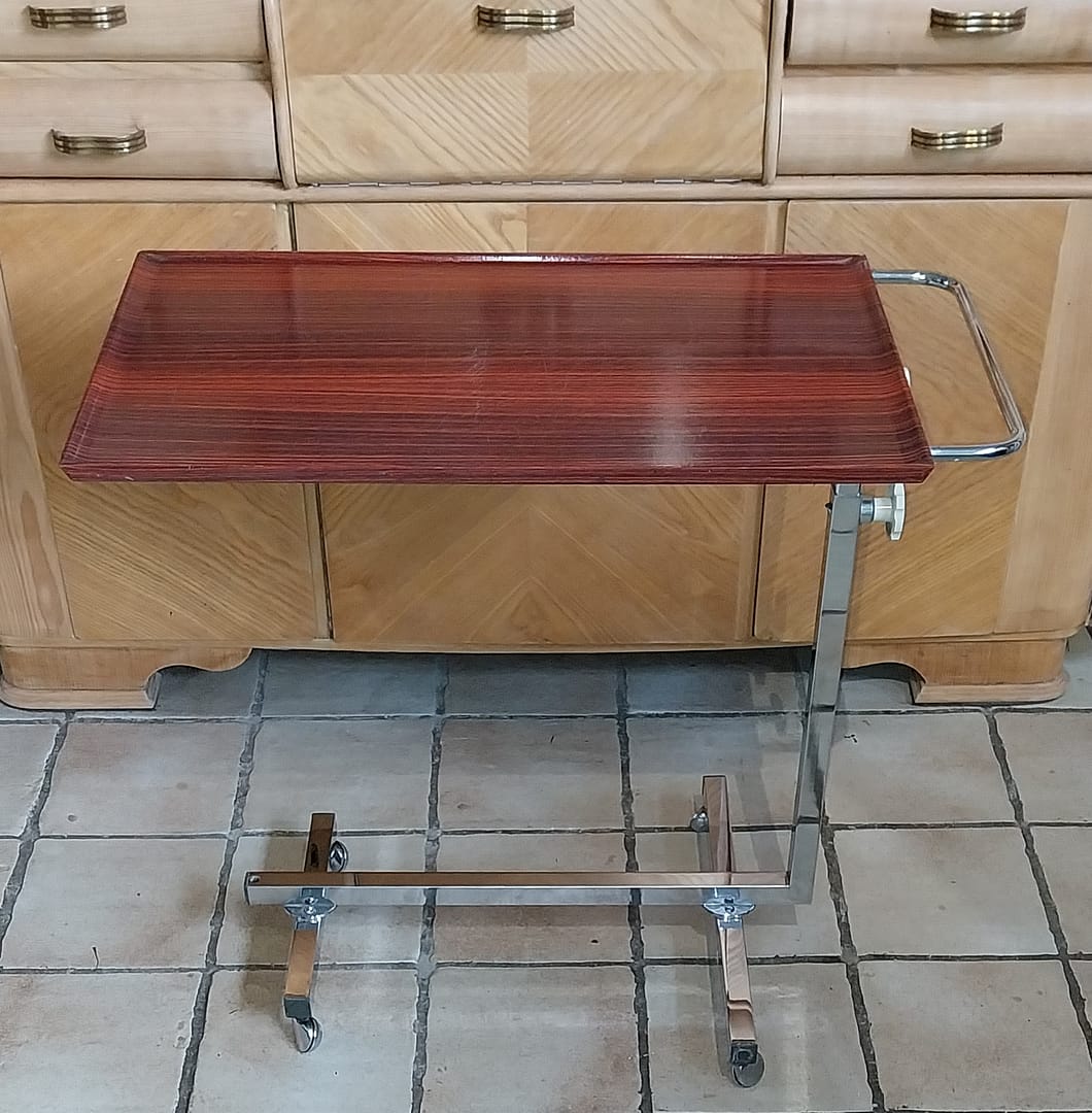 - Gebruik: Het werd oorspronkelijk ontworpen als een veelzijdige serveerwagen, bedtafel of leestafel die gemakkelijk over een bed of stoel geschoven kon worden.