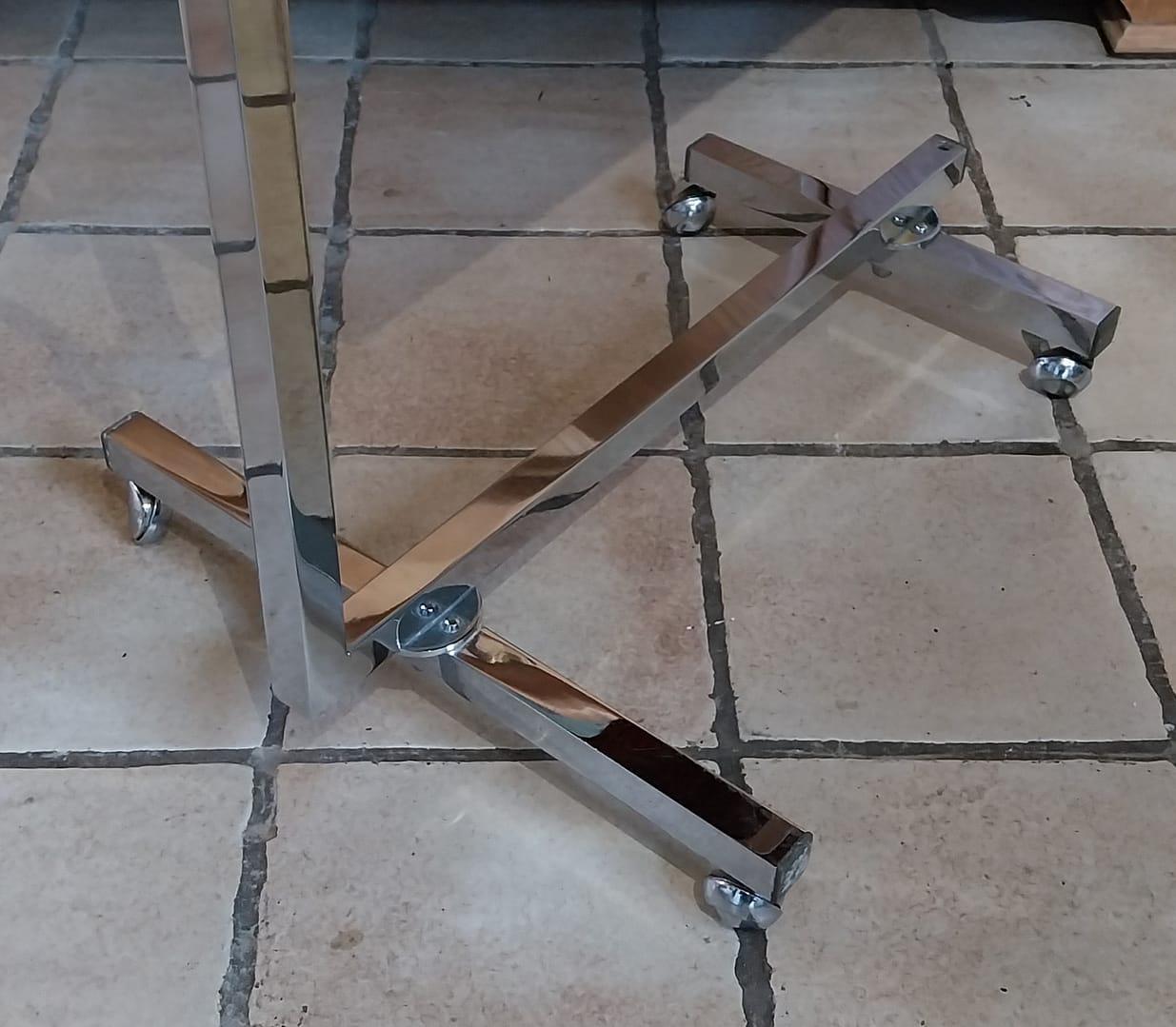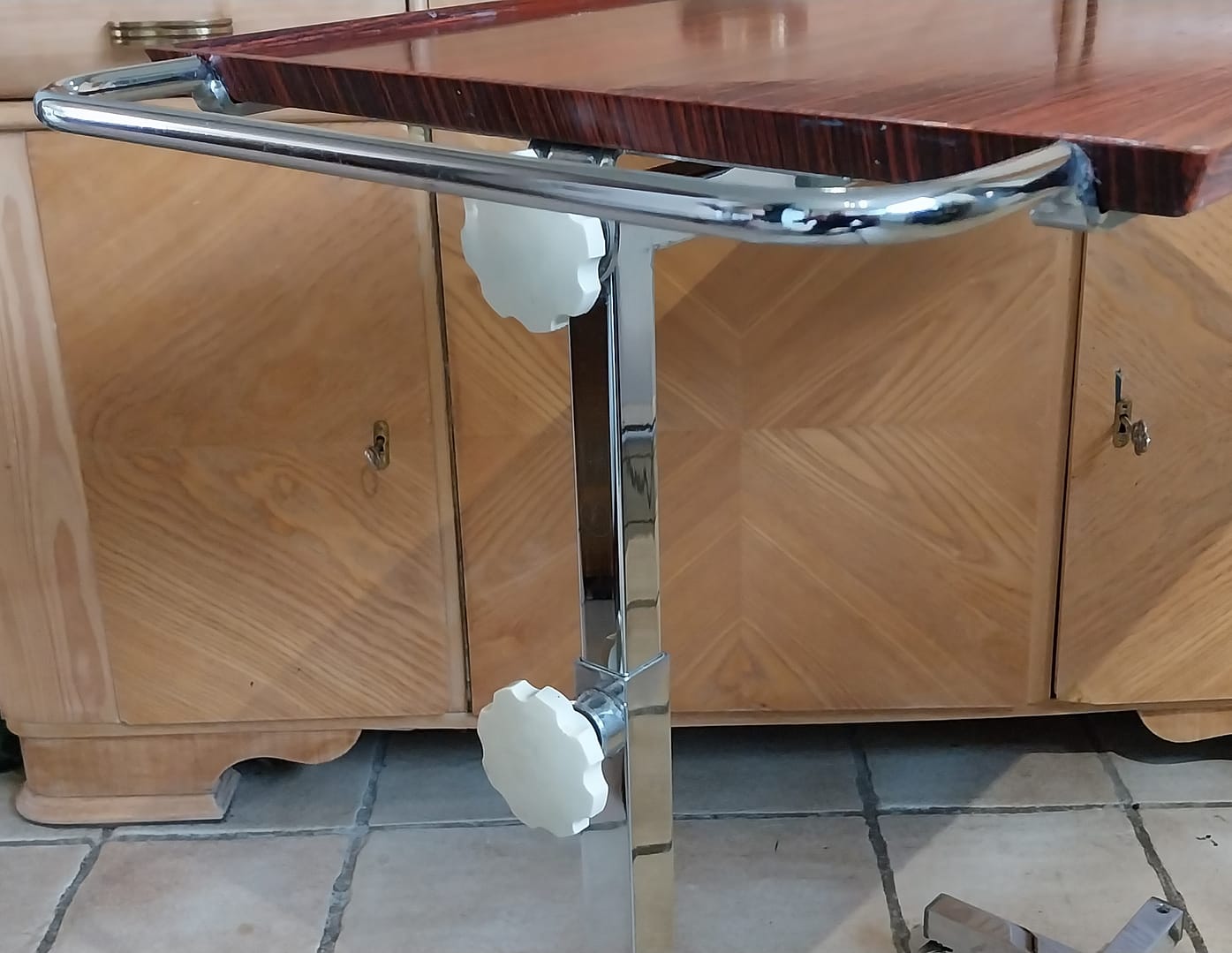 - Constructie: Het heeft een verchroomd metalen frame met wieltjes en een tafelblad met een teak-look.
