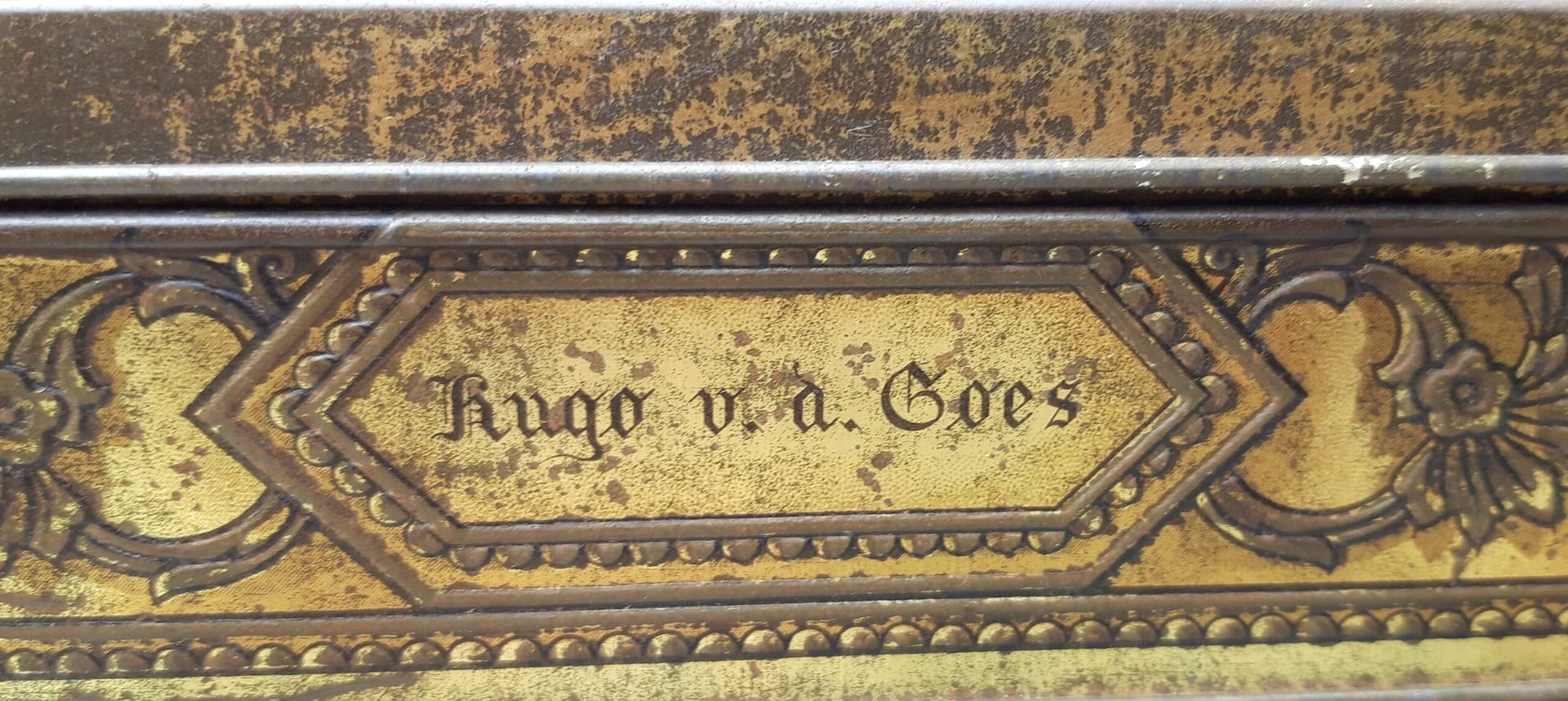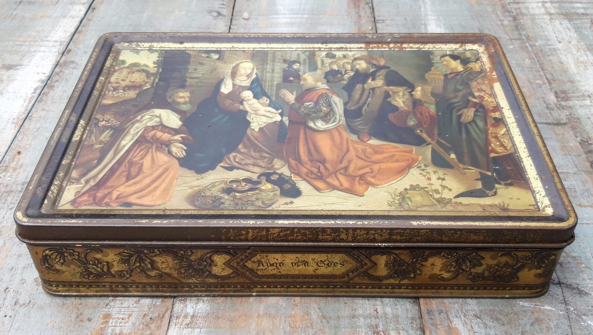 Oud Belgisch koekblik met een reproductie 15e eeuws schilderij van Hugo van der Goes.