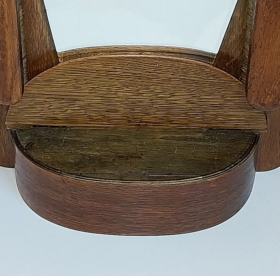 - Op de top en aan de voorzijde versierd met ornamenten van hout. De 5 hoeks spiegel is vastgeklemd tussen vier metalen klipjes, op een massieve eiken achterwand.