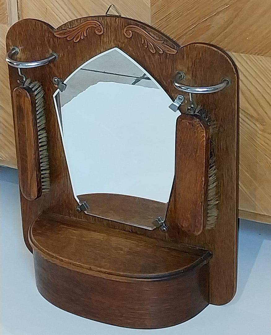 - Bijzondere antieke hal spiegel met links en rechts een kledingborstel en aan de voorzijde een bakje voor bijvoorbeeld kammen, borstels of handschoenen.