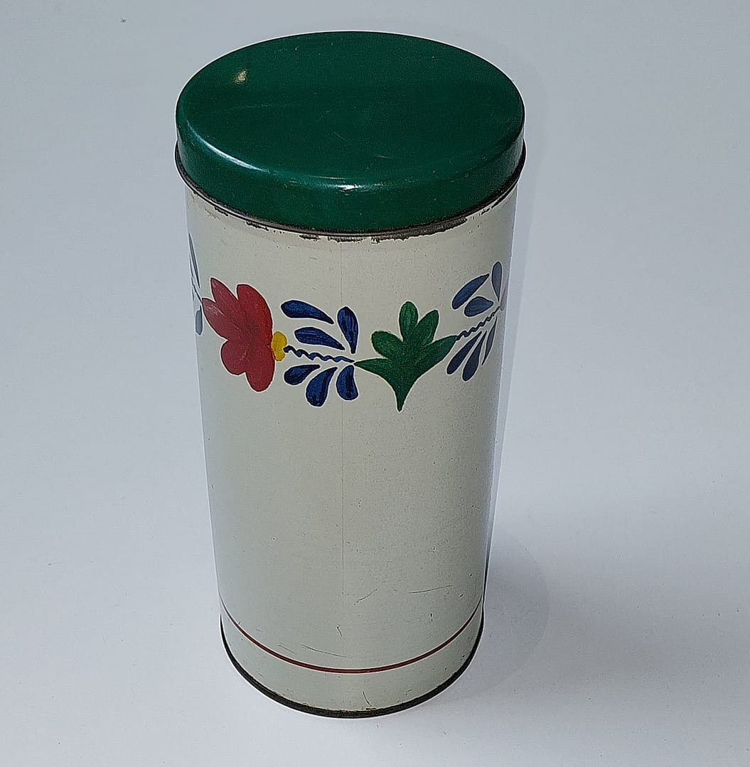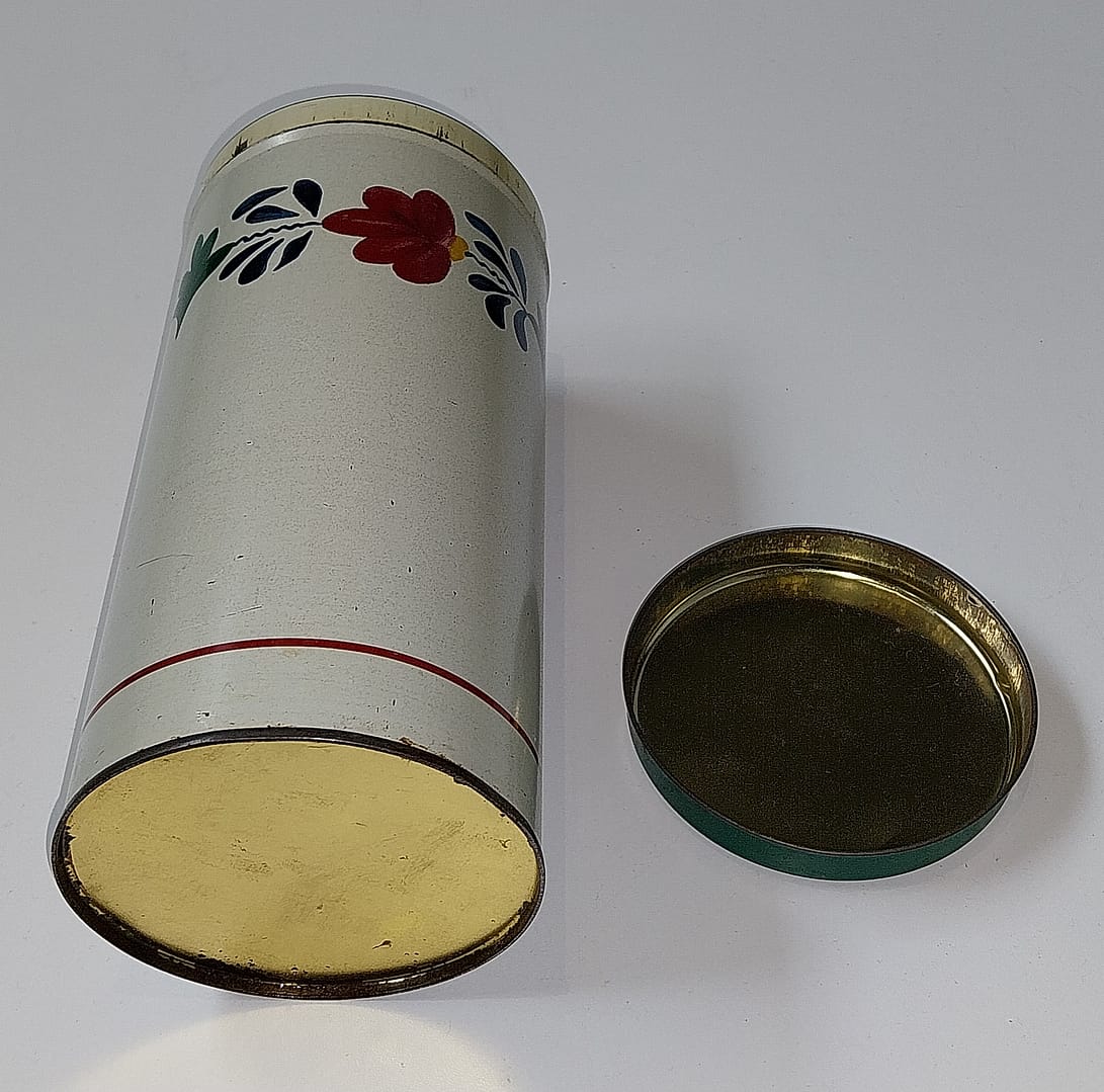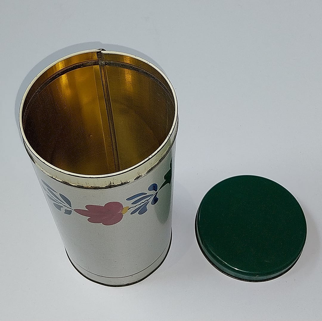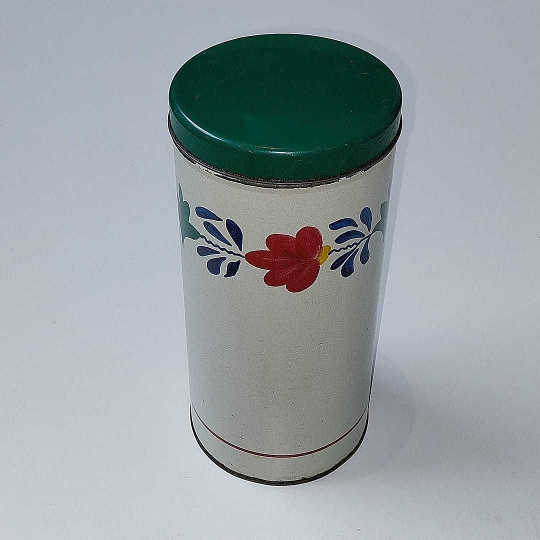 - Ontwerp: Een crèmekleurige metalen bus met een donkergroen deksel en het kenmerkende decor met rode, blauwe en groene bloemen en bladeren.