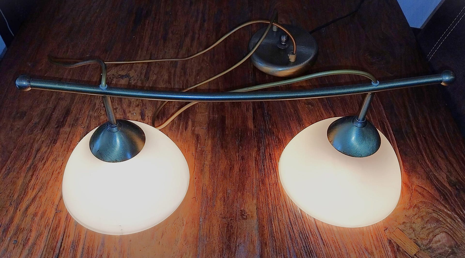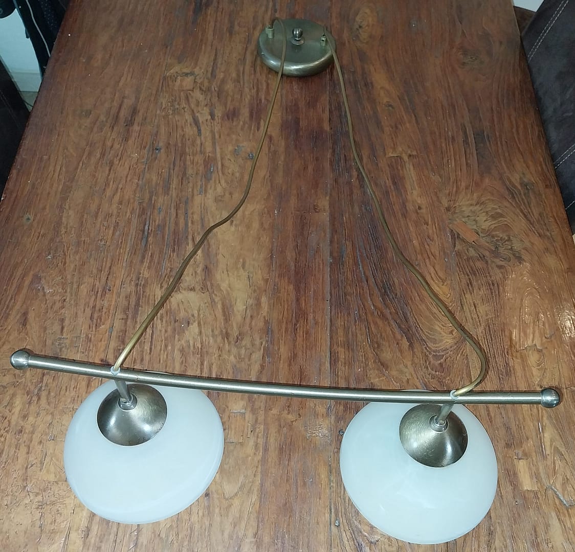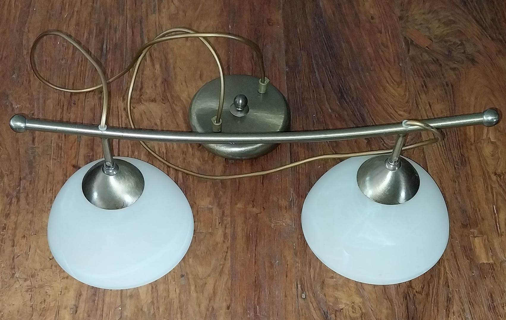 • Deze plafondlamp heeft een gebogen stang waaraan 2 st. opaalglazen lampenkappen hangen. De metalen onderdelen hebben een licht goud/messingkleurige afwerking.