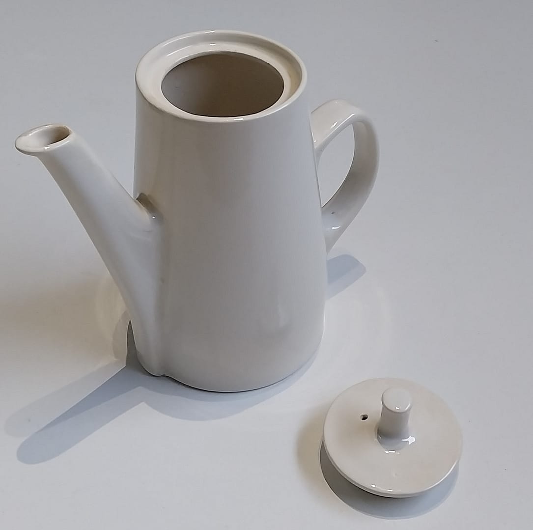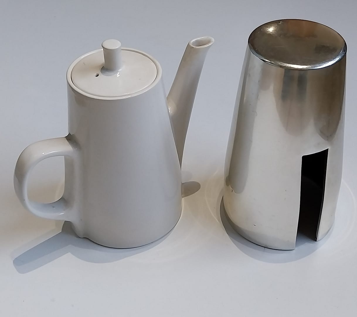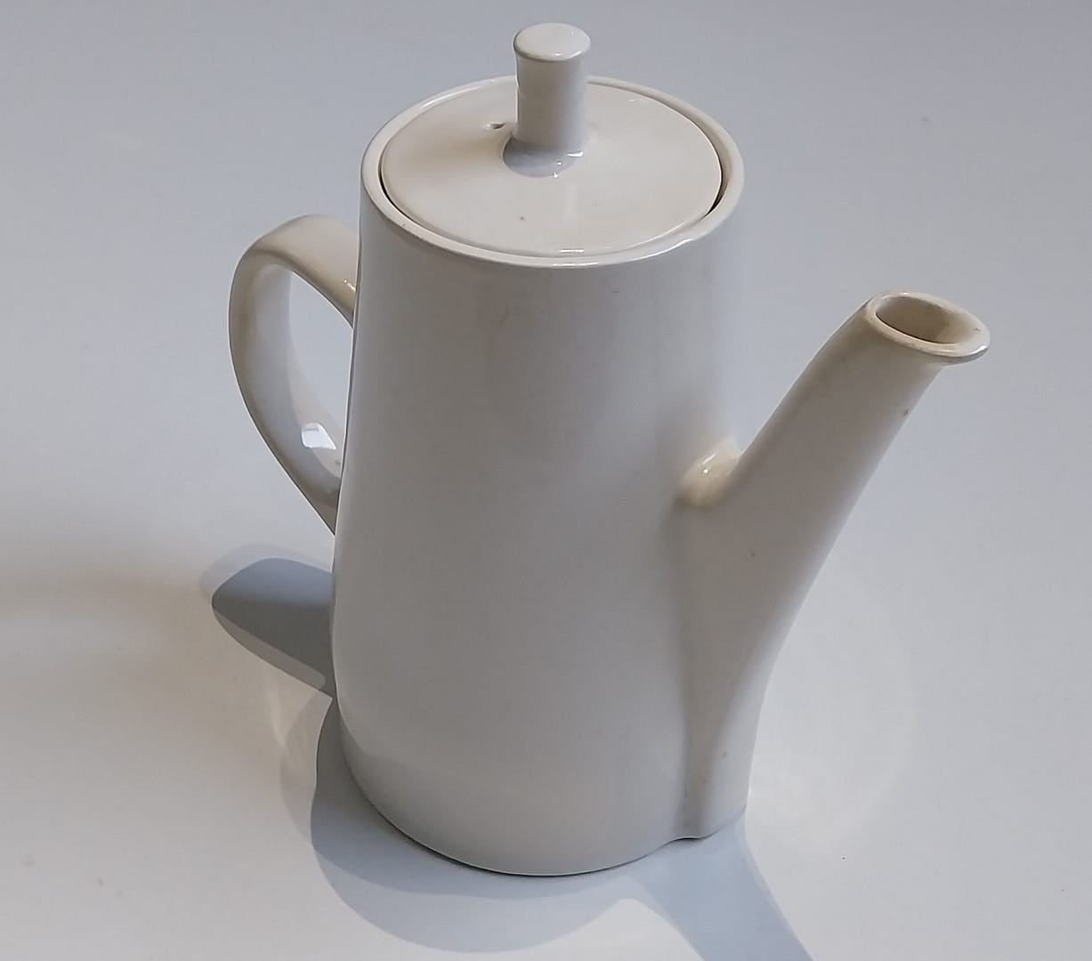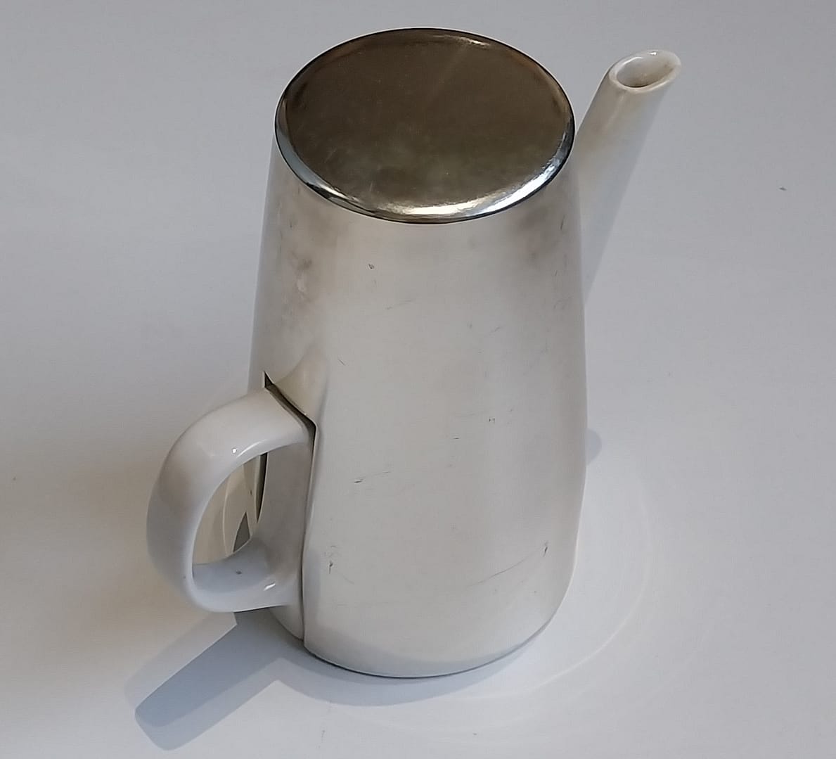 - De pot: Een wit porseleinen model, een koffie- of theekan uit het midden van de vorige eeuw (Mid-Century Modern). Deze potten werden geproduceerd door Mie Gila in Duitsland, voornamelijk in de jaren 50 en 60.