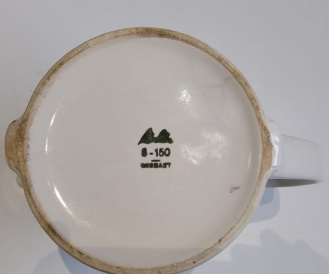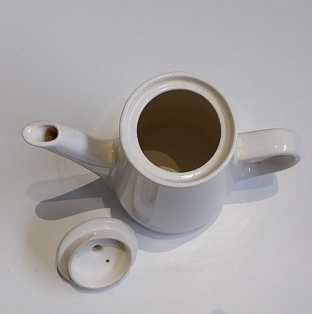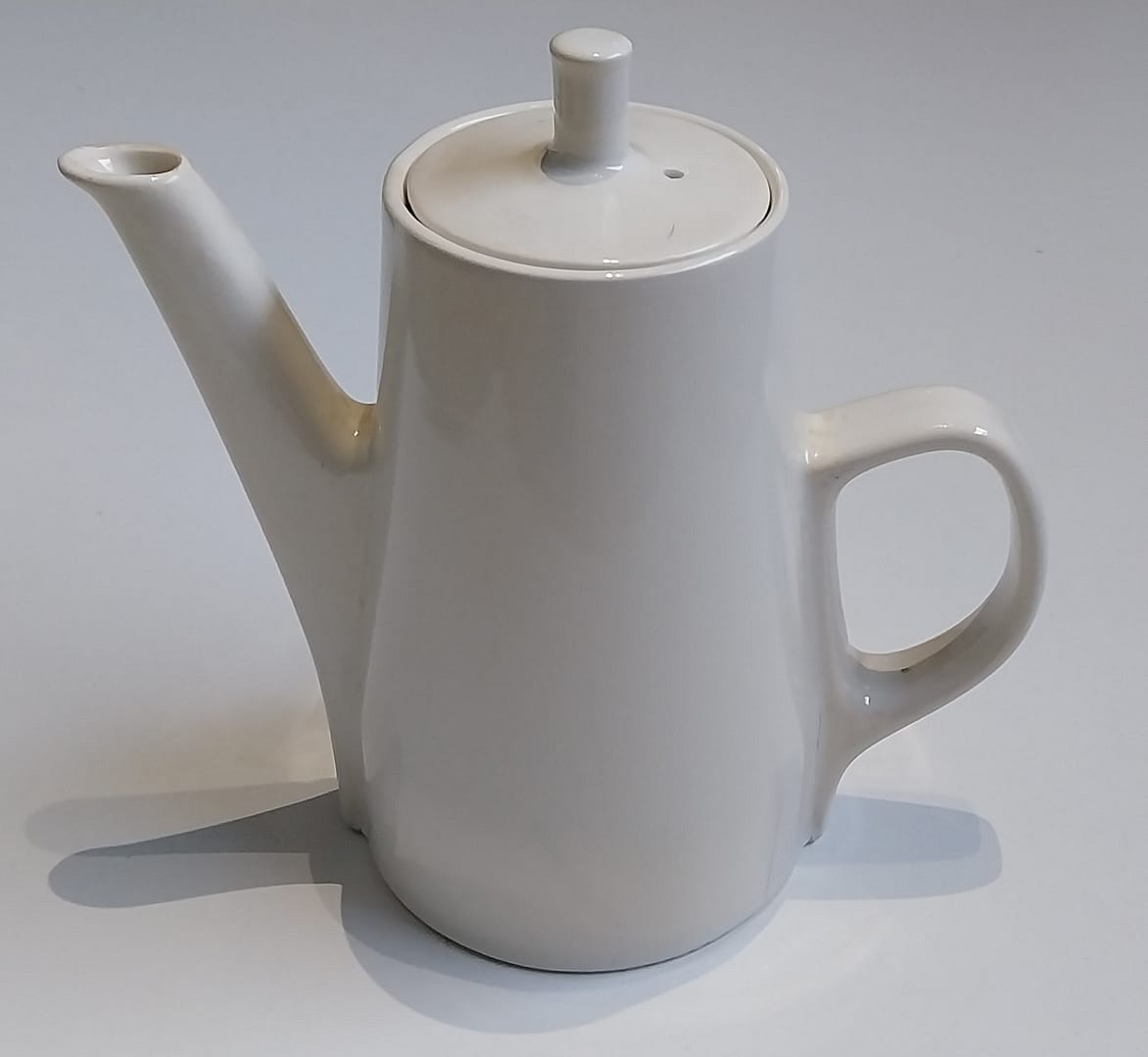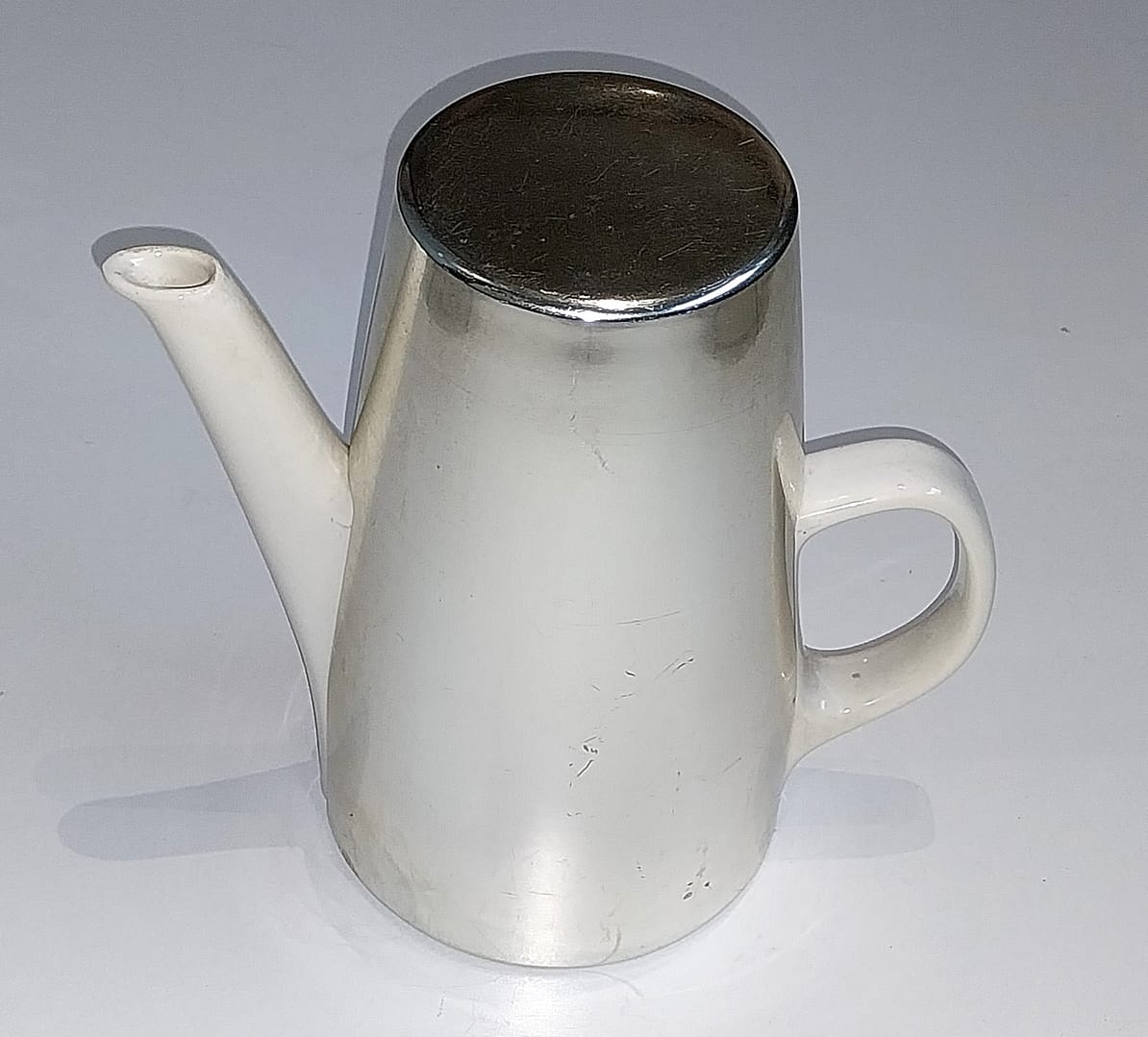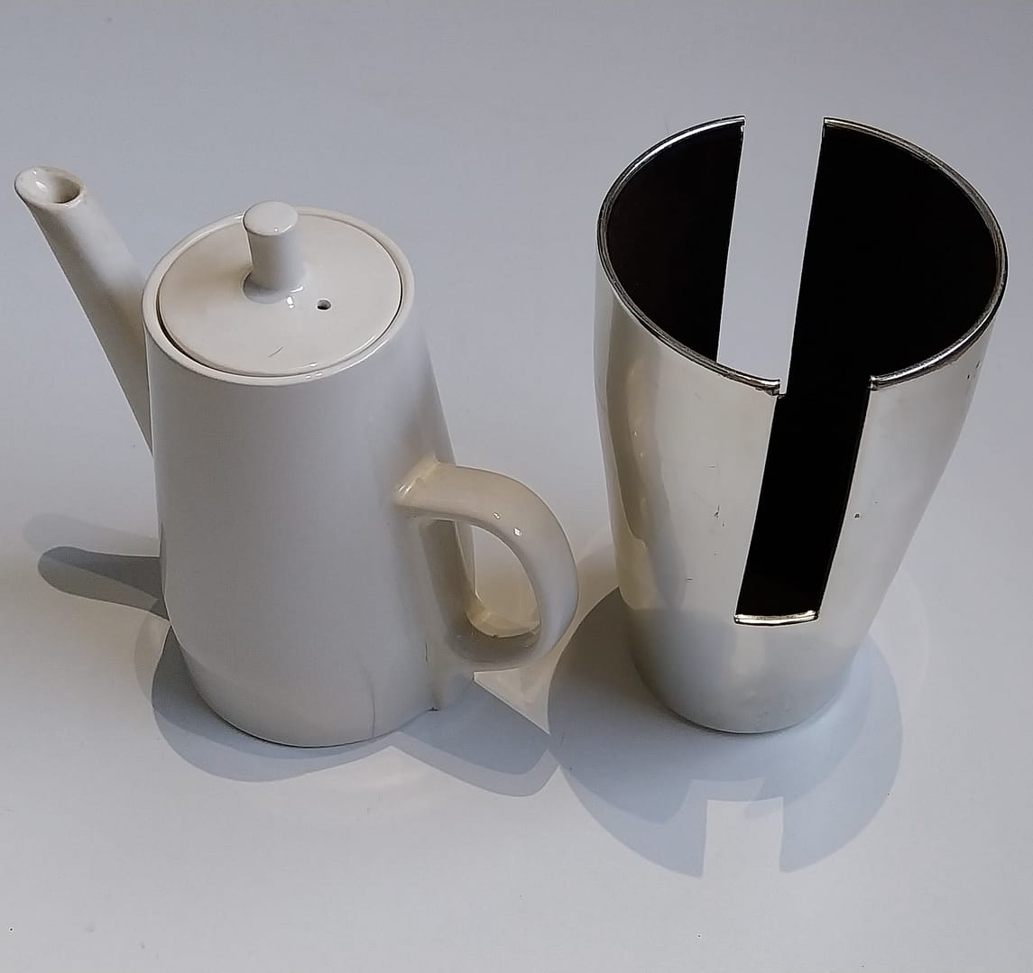 - De pot: Een wit porseleinen model, een koffie- of theekan uit het midden van de vorige eeuw (Mid-Century Modern). Deze potten werden geproduceerd door Mie Gila in Duitsland, voornamelijk in de jaren 50 en 60.