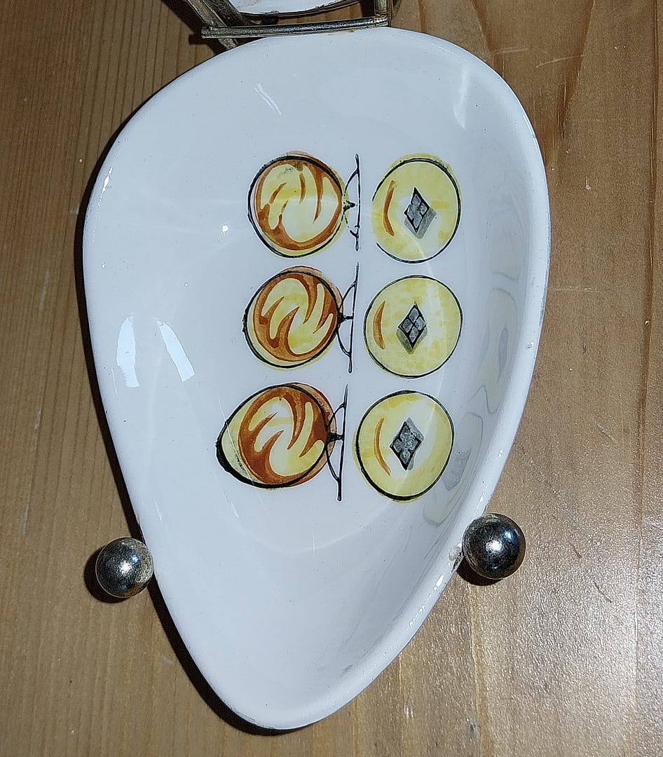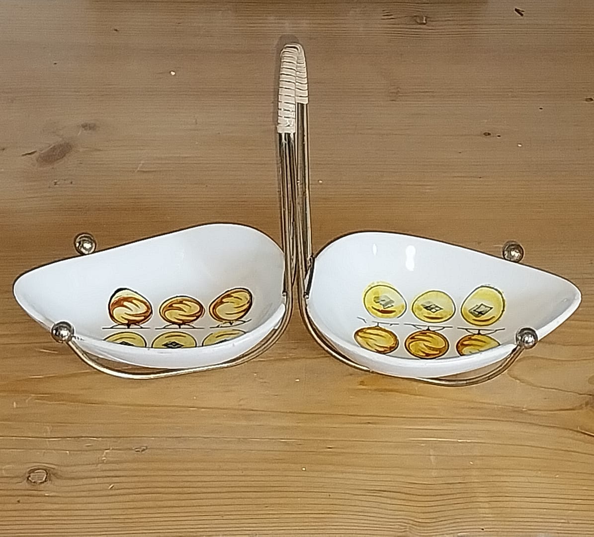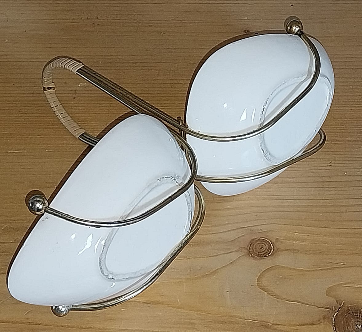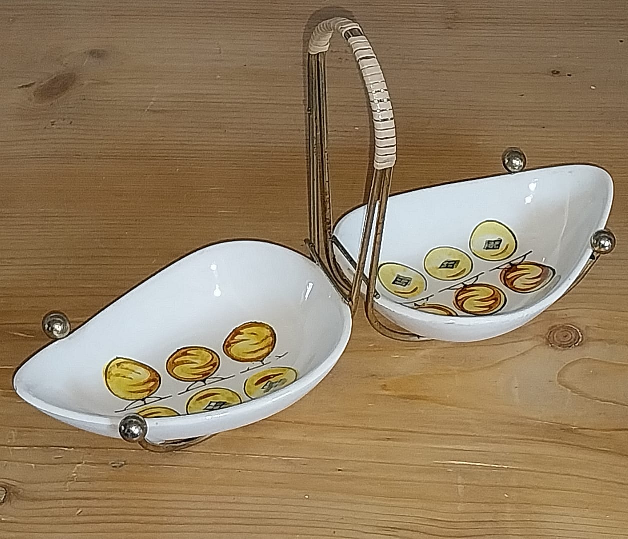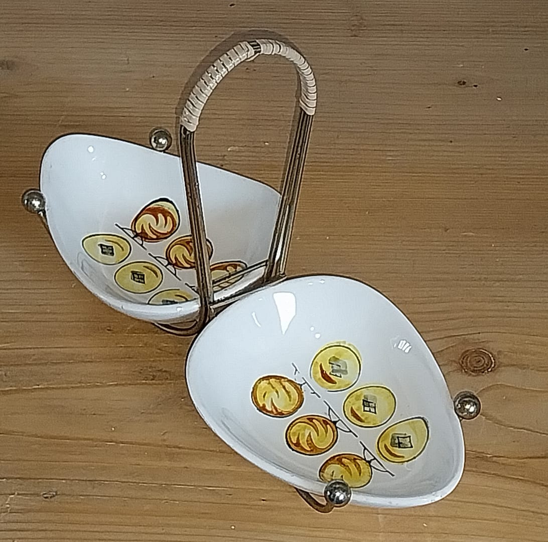 - Dit houdertje met 2 schaaltjes dateert uit de jaren ’50. De schaaltjes zijn uitneembaar uit houdertje. Het houdertje is messing kleurig. Het setje verkeert geheel in goede staat.
