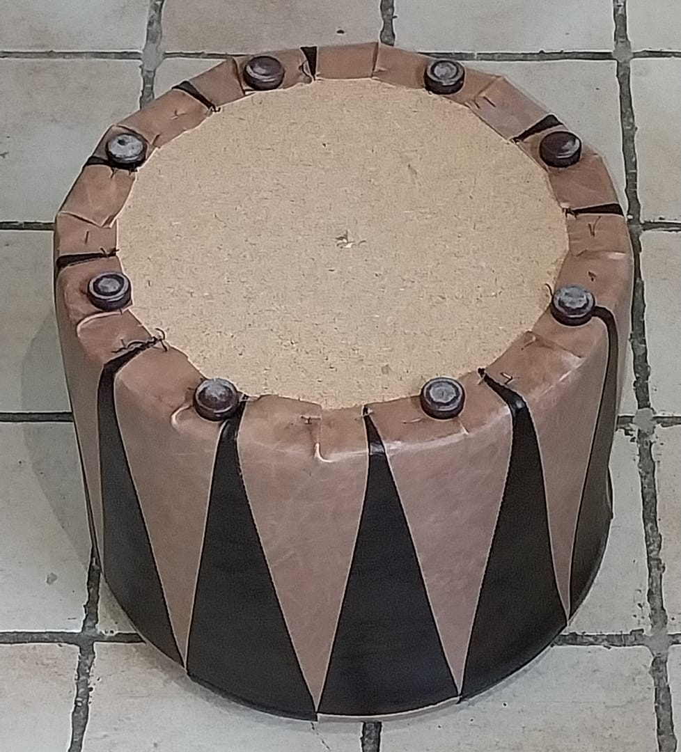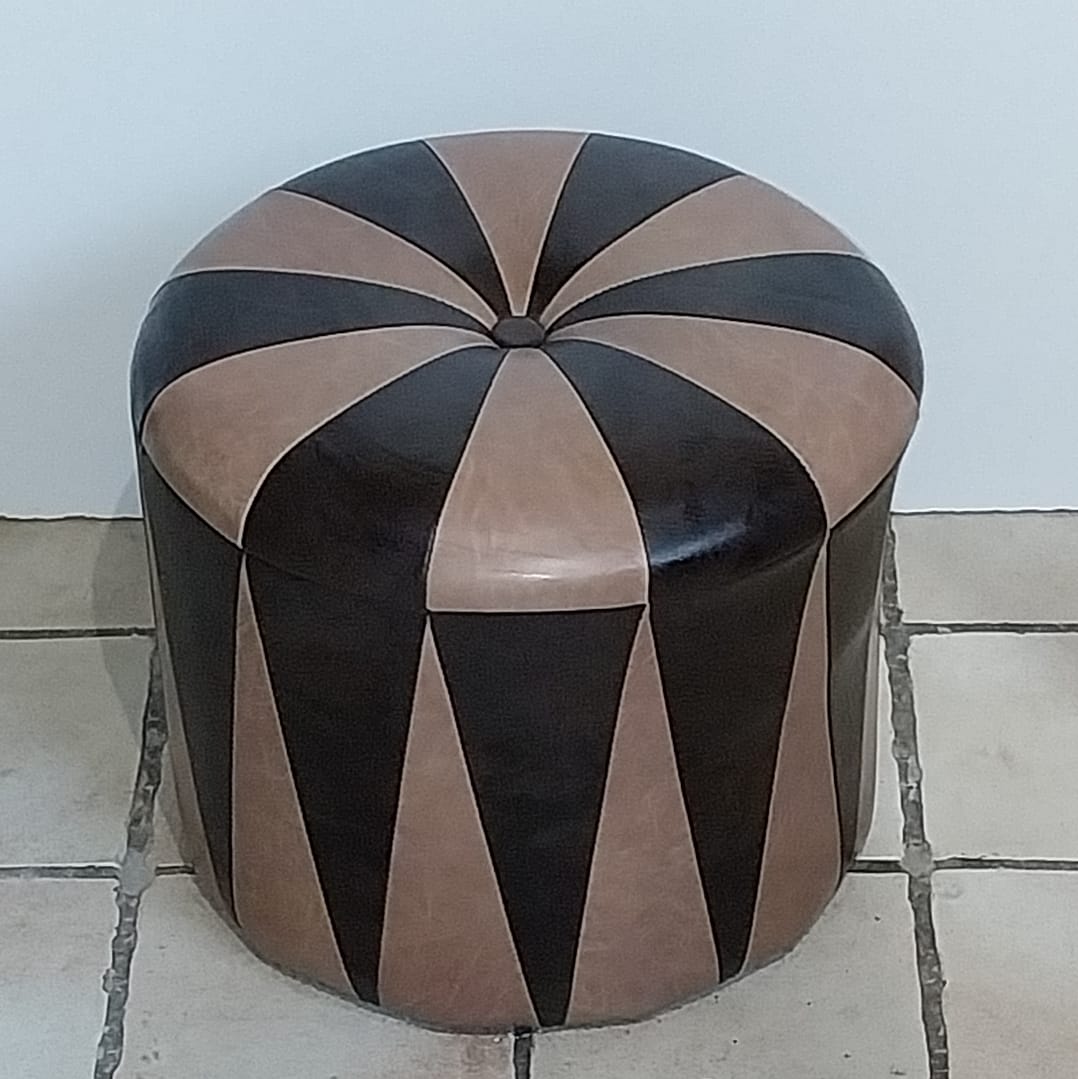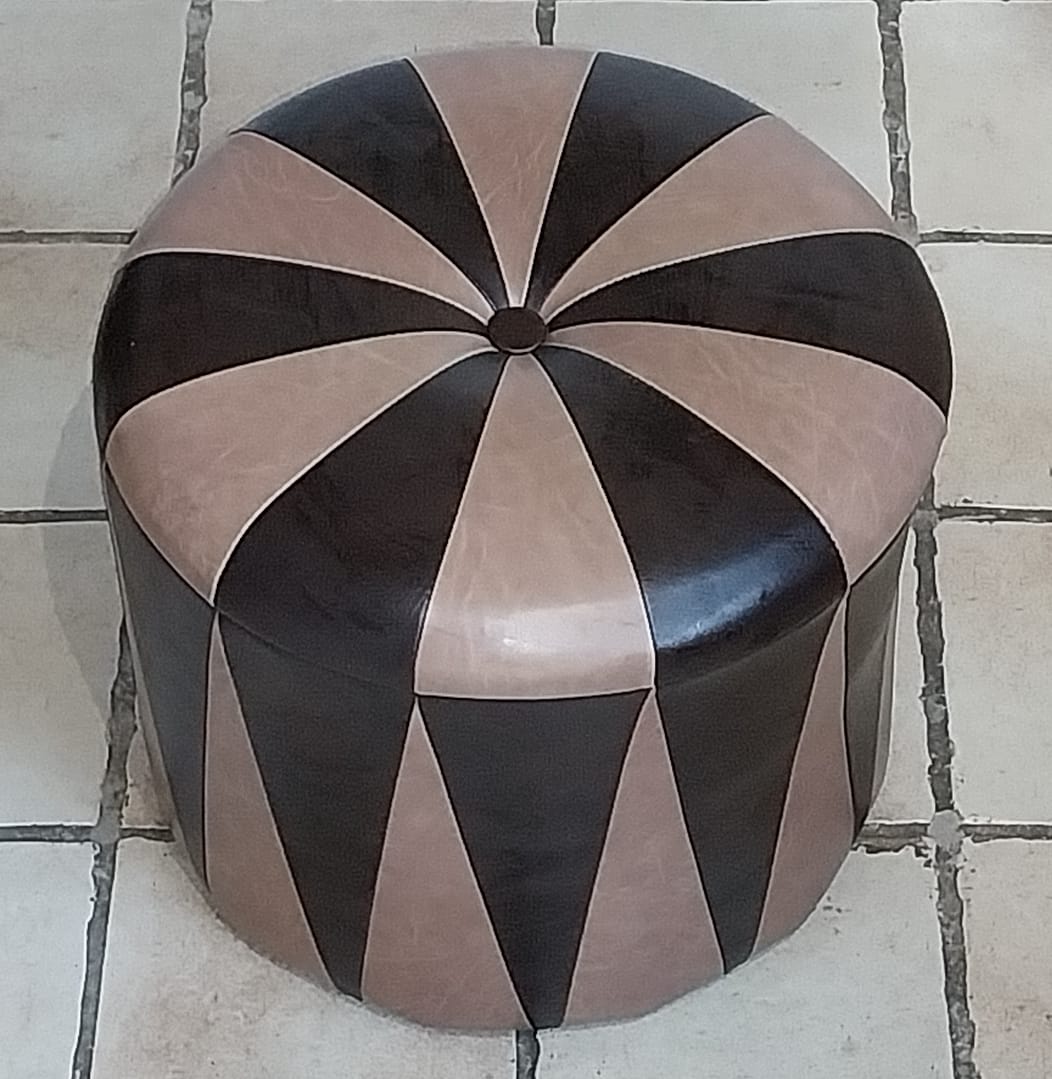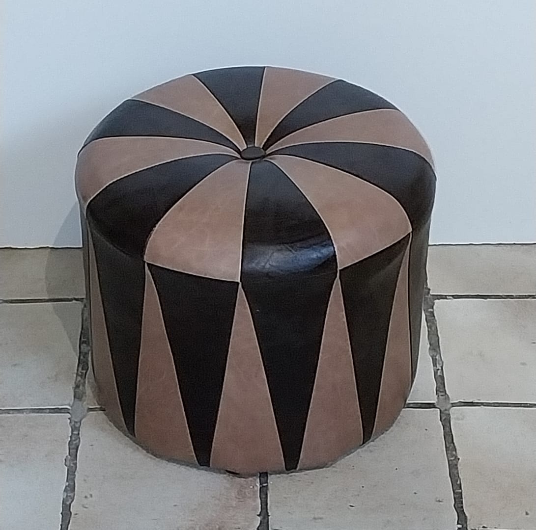 • Prachtig 2-kleurige (bruin en beige kleur) leren poef dateert uit de jaren ’70 en verkeert in perfecte staat.