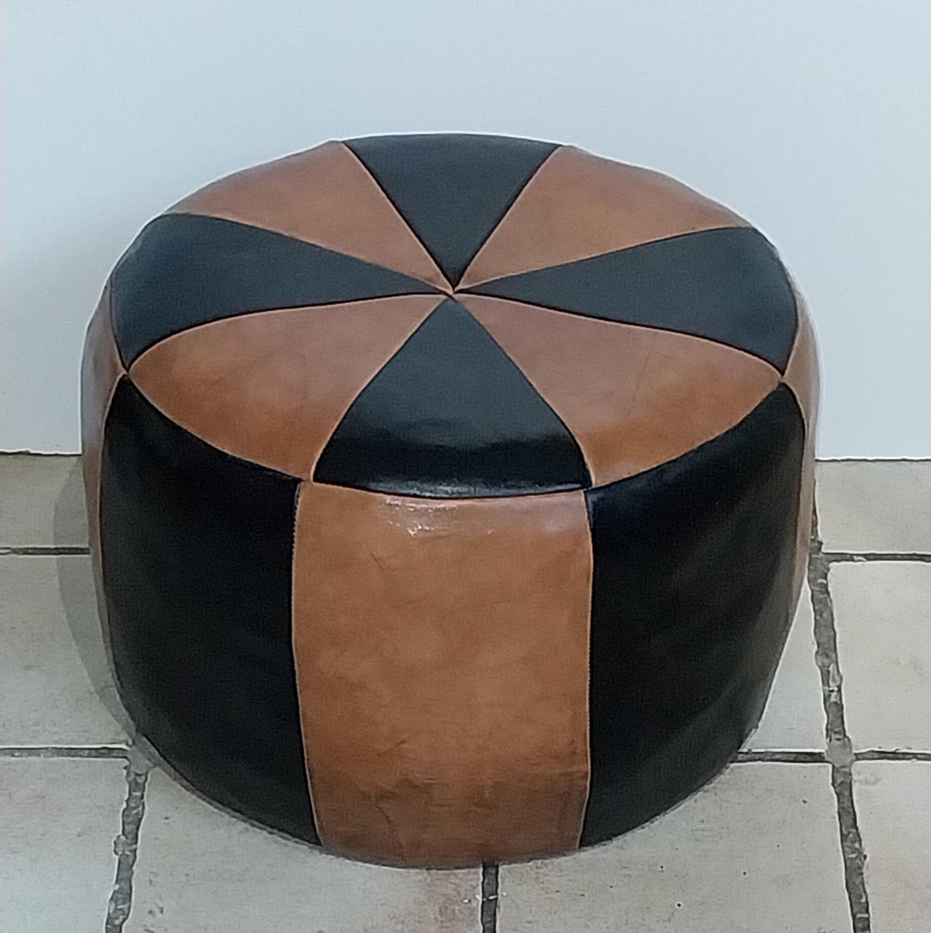 • Prachtig 2-kleurige (bruin en cognac kleur) leren poef dateert uit de jaren ’70 en verkeert in perfecte staat.