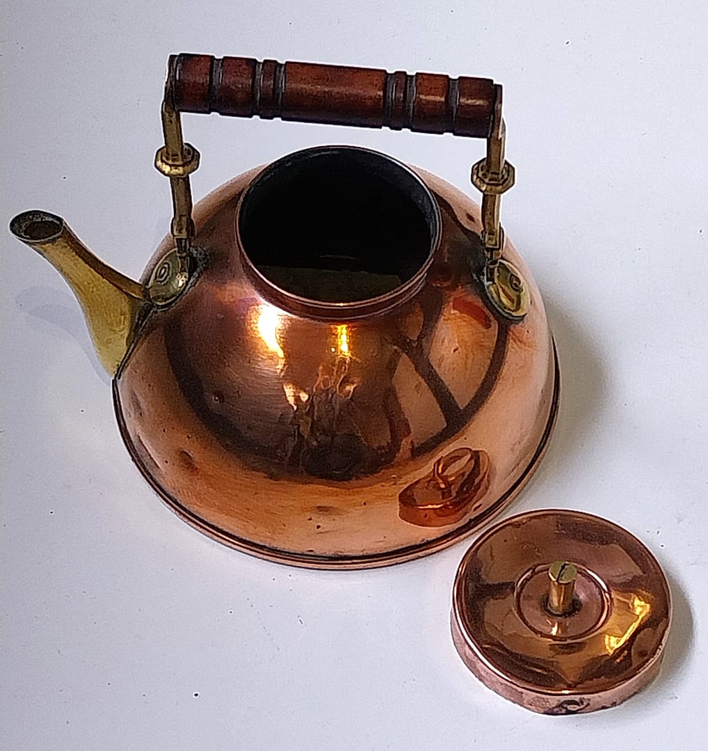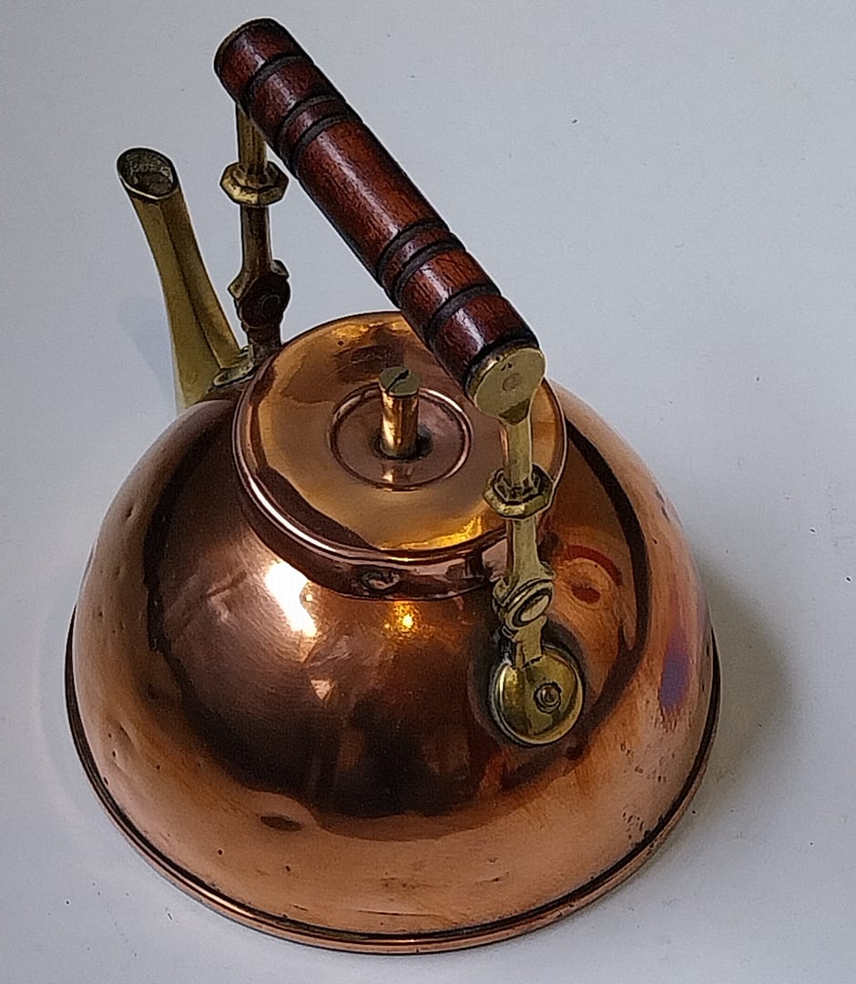 • Een mooie koperen/messing ketel met houten handgreep nog in goede staat, is niet lek. Dateert van begin 1900