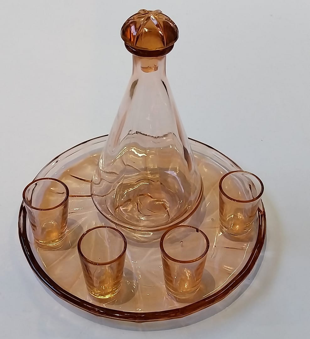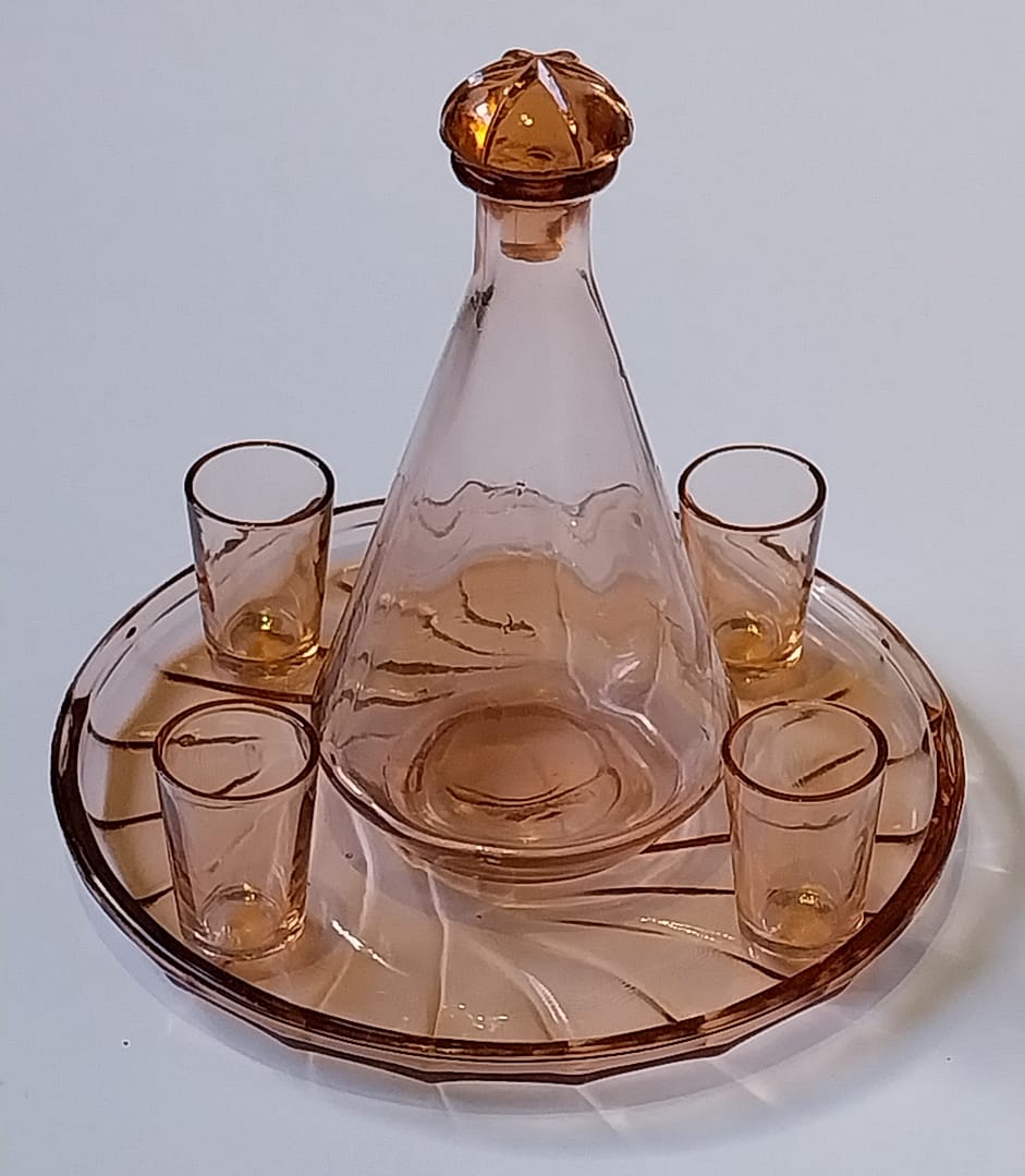 - Stijl: Art Deco, wat terug te zien is in de geometrische vormen van de karaf en het bijpassende dienblad.