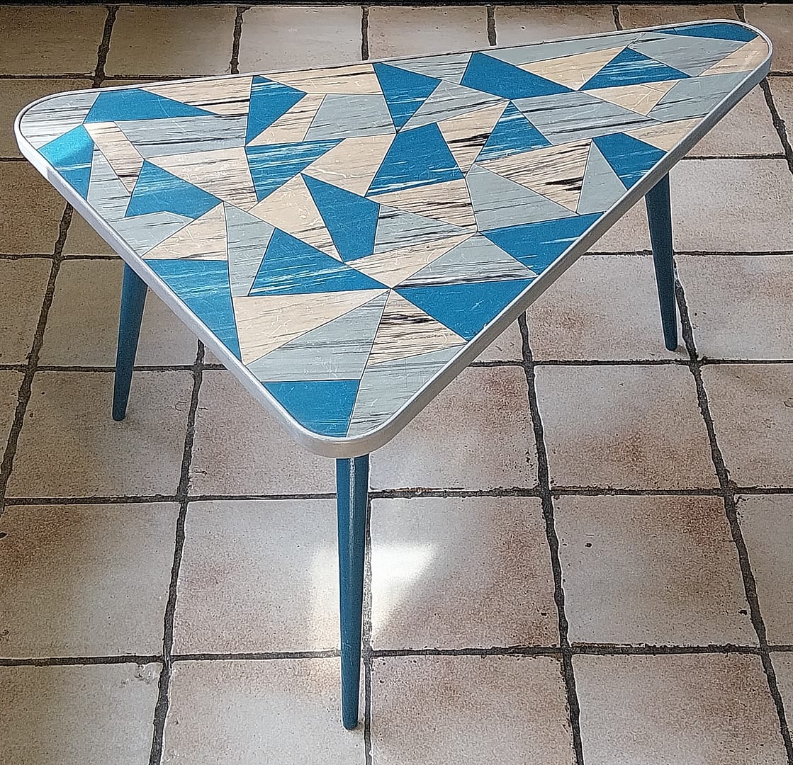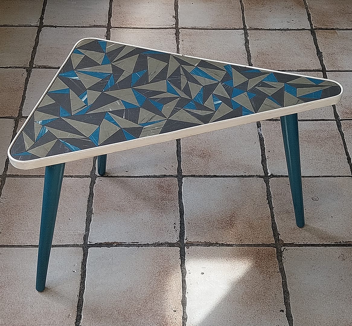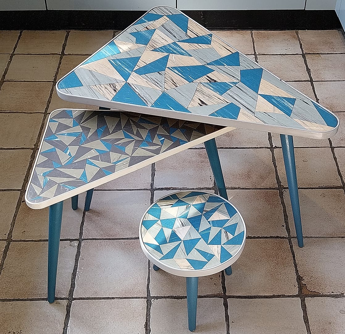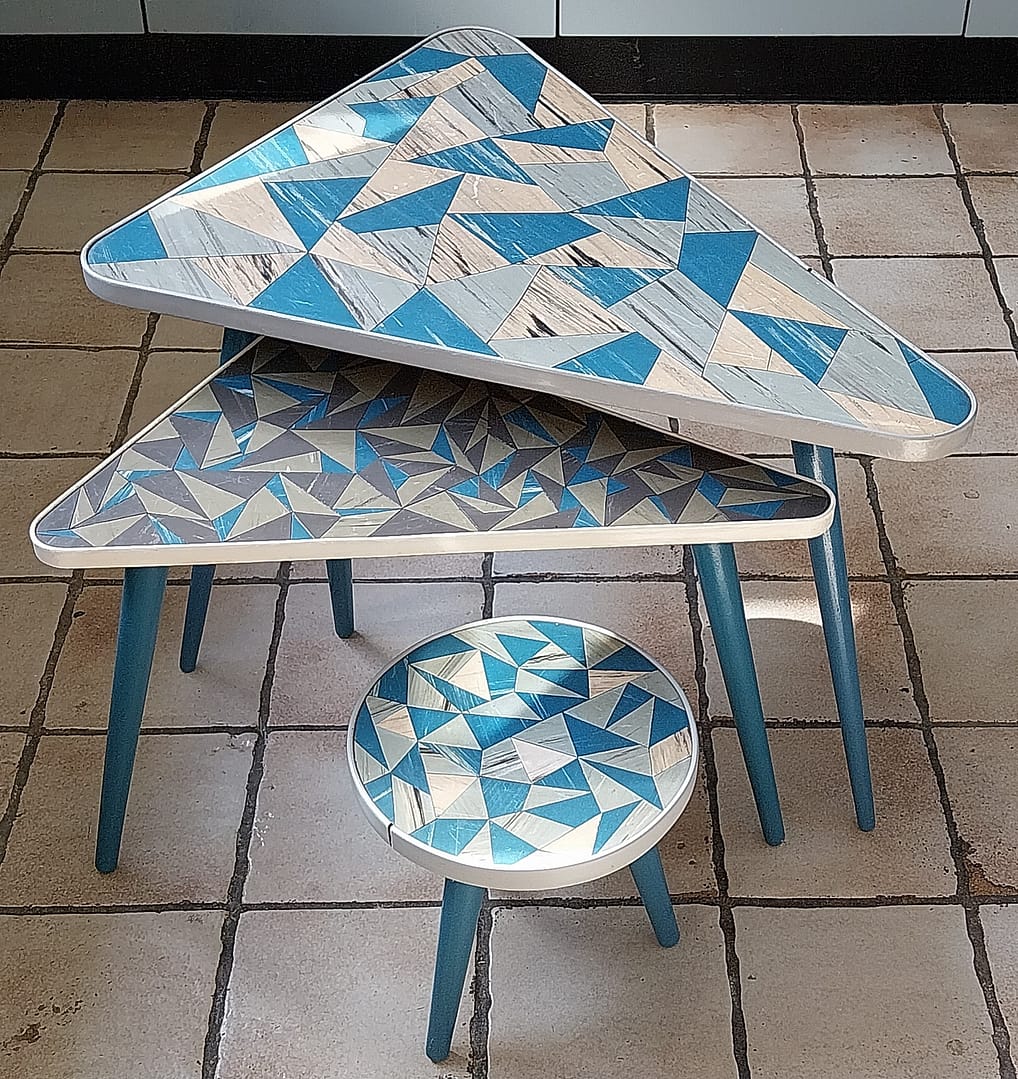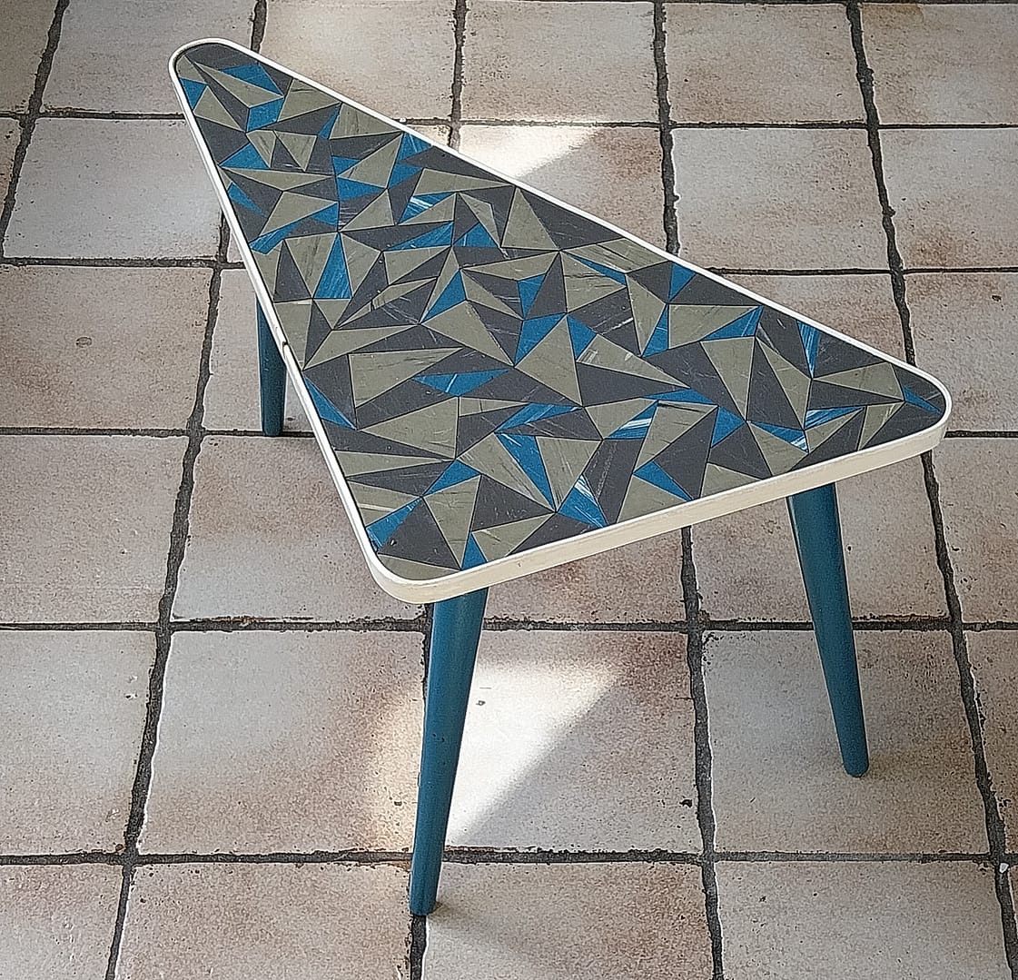 - Set á 3 stuks bijzettafeltjes met een geometrisch driehoekig patronen op de tafelbladen. Dit type meubilair was erg populair in de jaren ’50 en ’60, vaak aangeduid als de “Rockabilly” stijl.