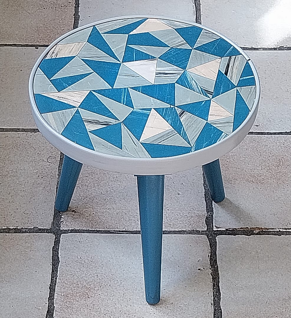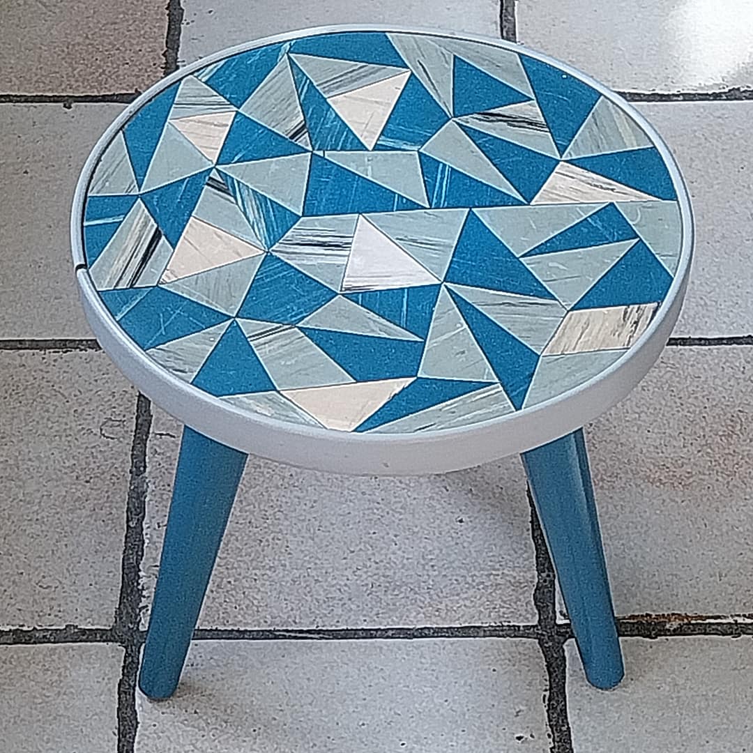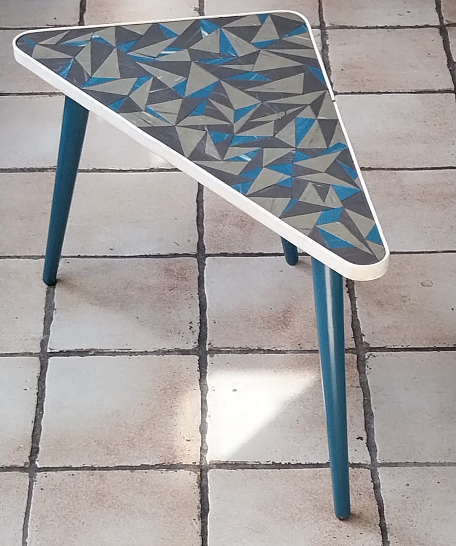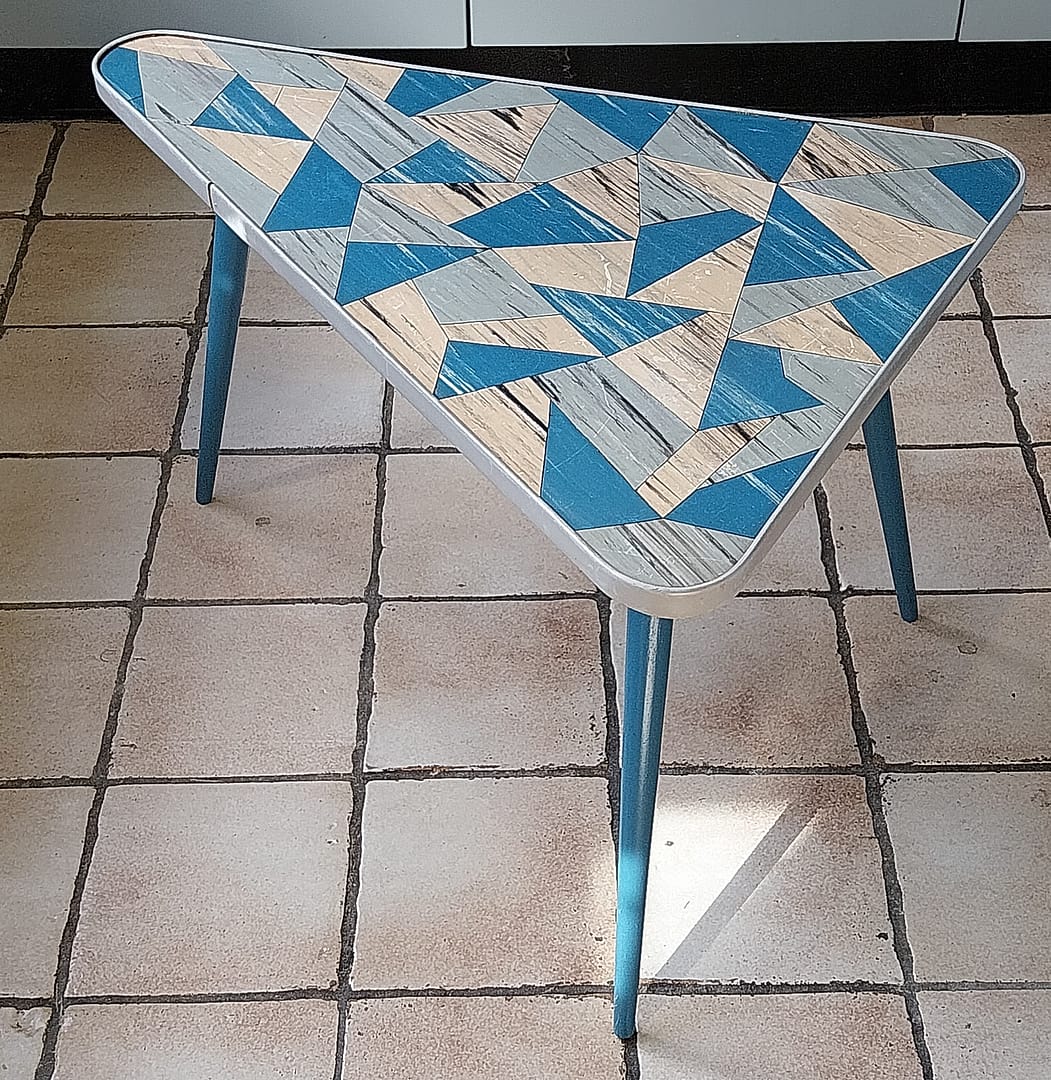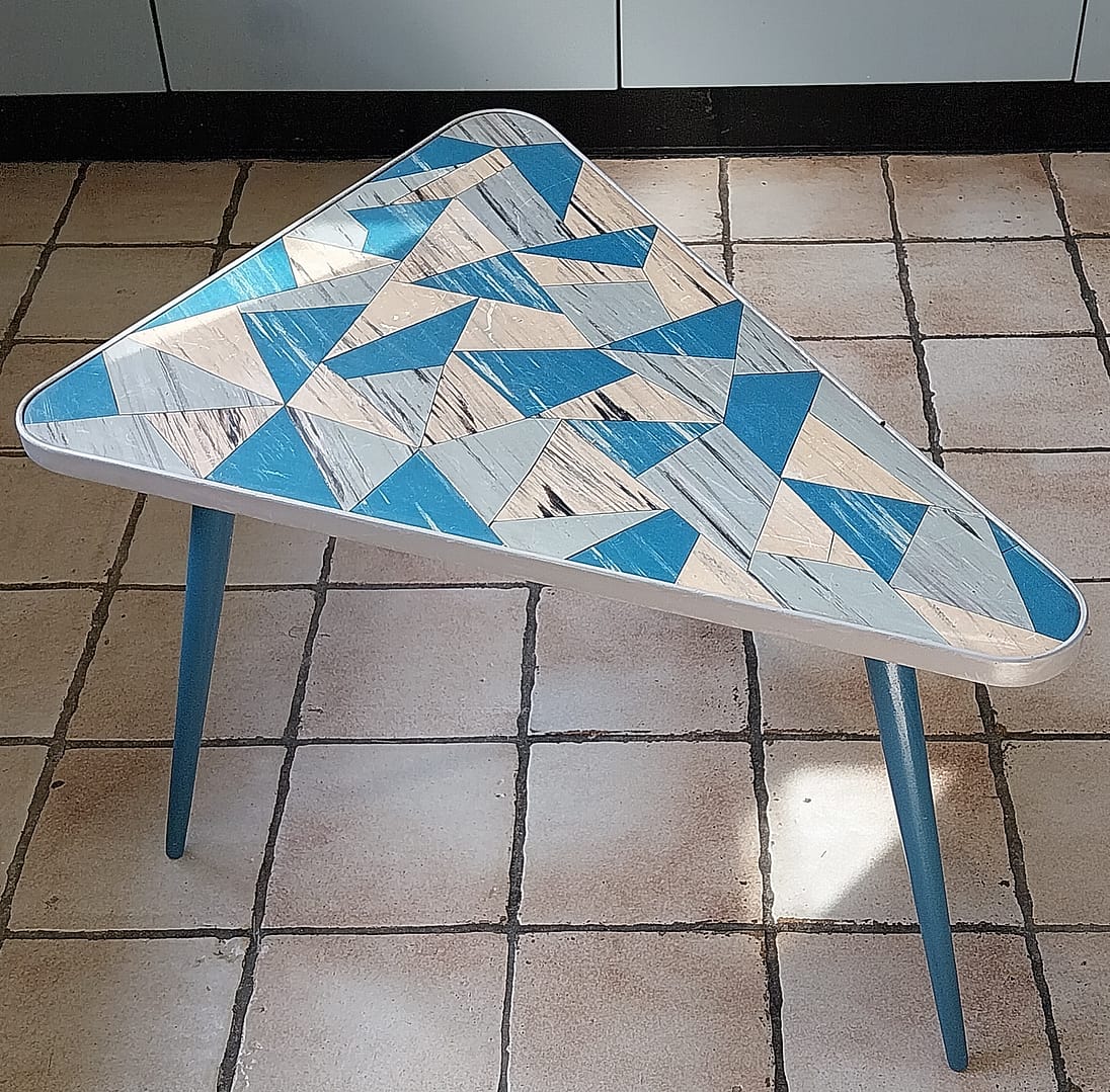 - Set á 3 stuks bijzettafeltjes met een geometrisch driehoekig patronen op de tafelbladen. Dit type meubilair was erg populair in de jaren ’50 en ’60, vaak aangeduid als de “Rockabilly” stijl.