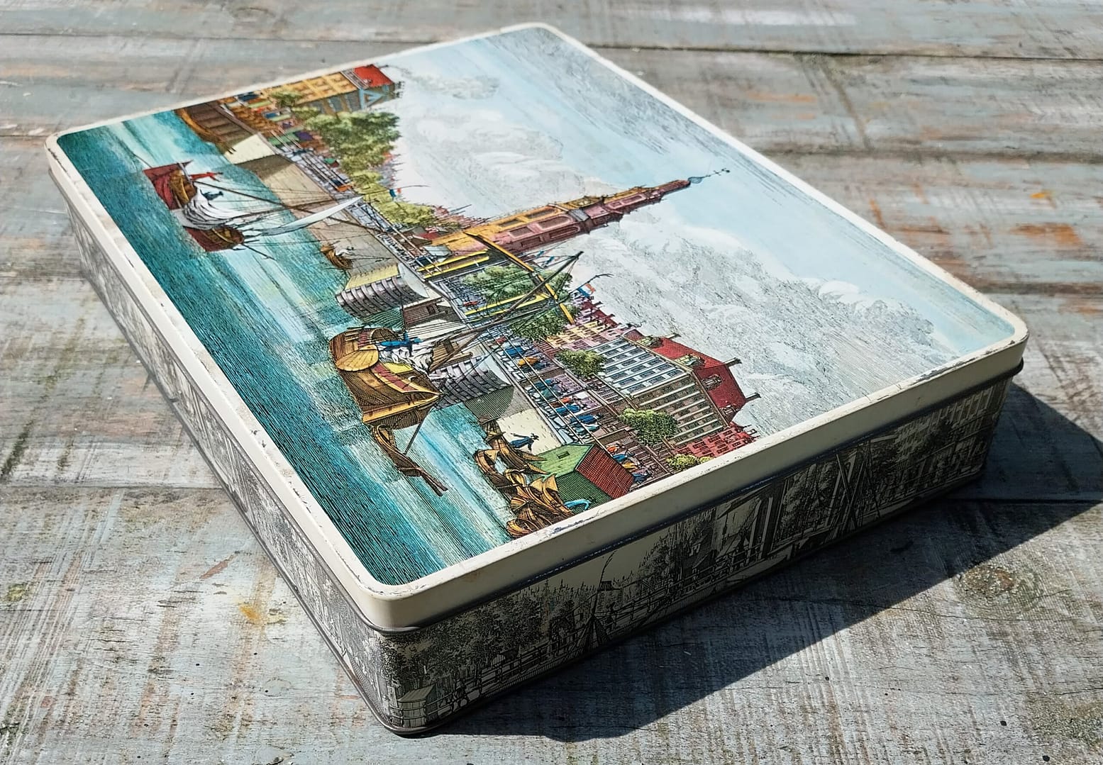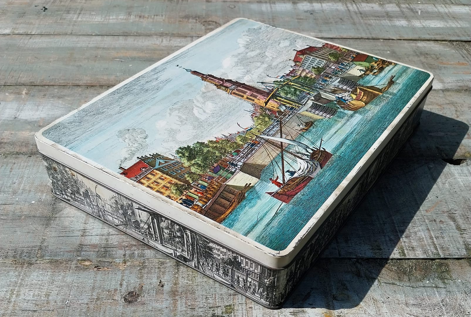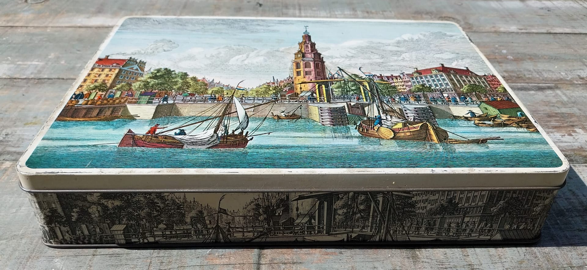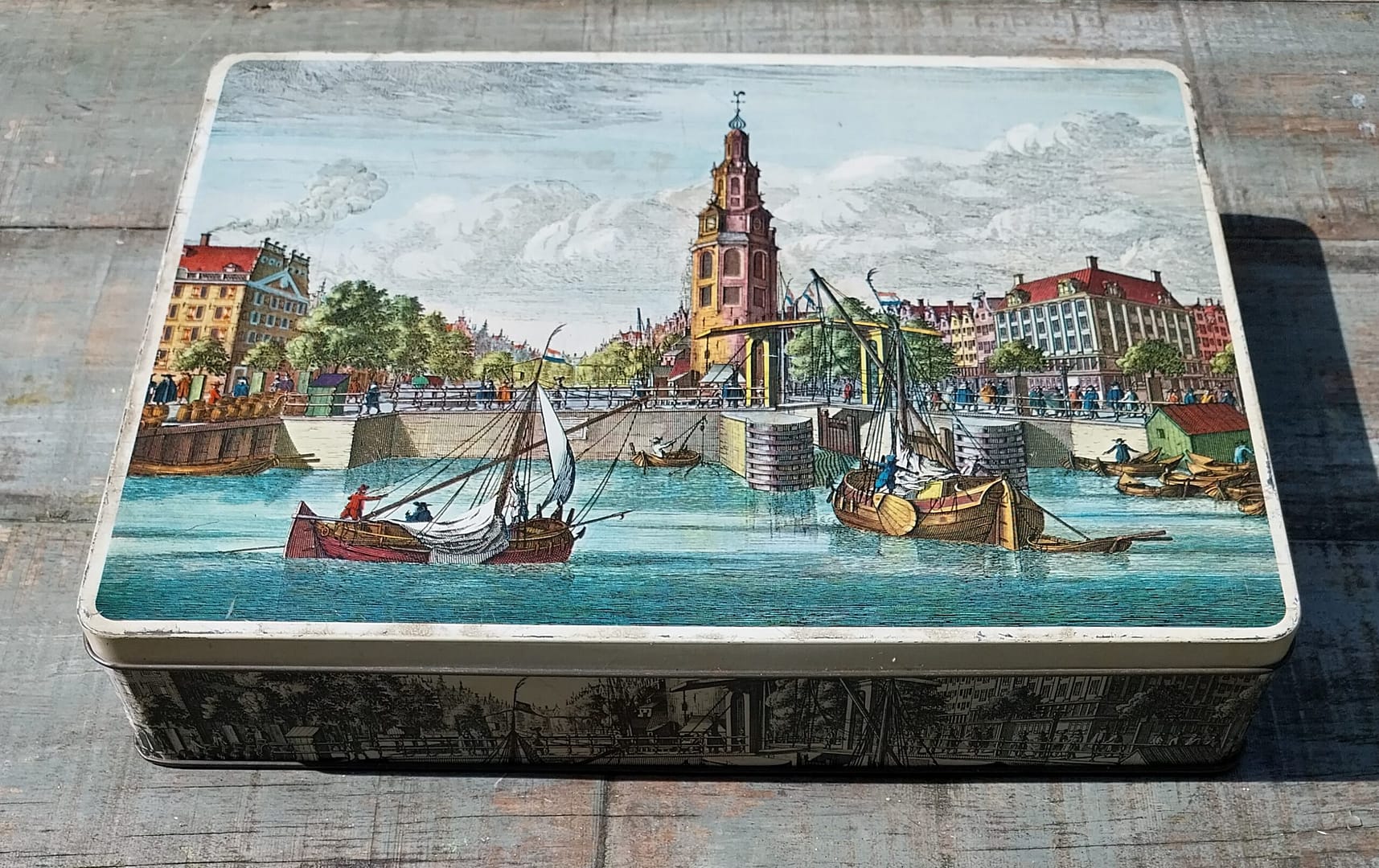 De afbeelding op de deksel toont de Montelbaanstoren aan de Oudeschans, gezien vanaf het water in de 18e eeuw.