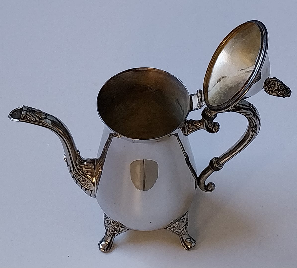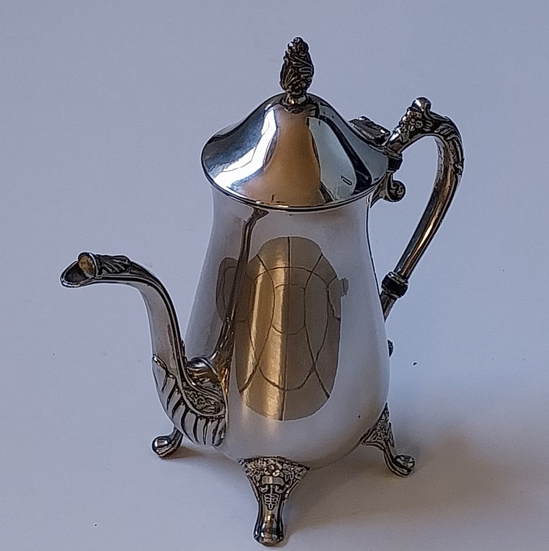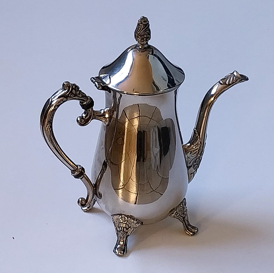 Verzilverde koffie – theepot in een klassieke Rococo-stijl. Is rijkelijk versierd met florale motieven op de poten, het handvat en de tuit.