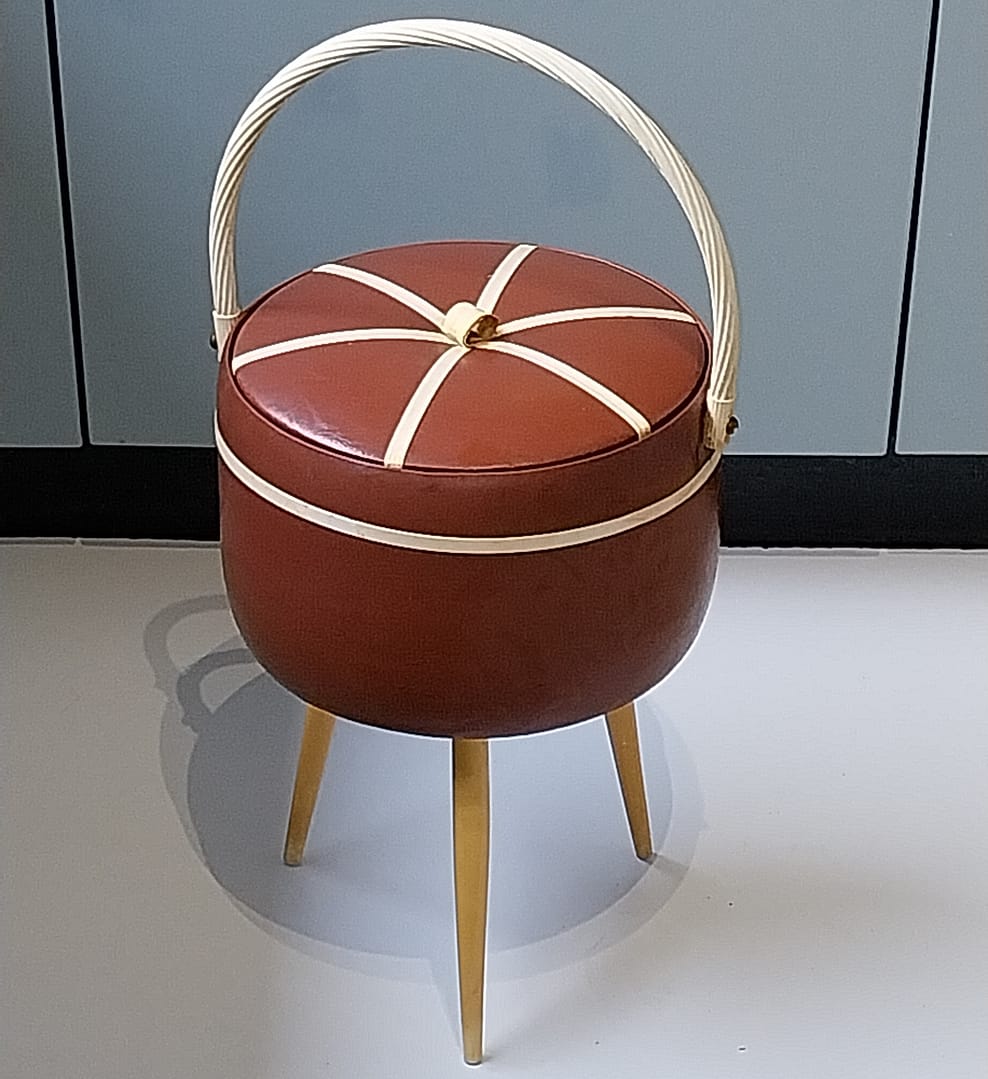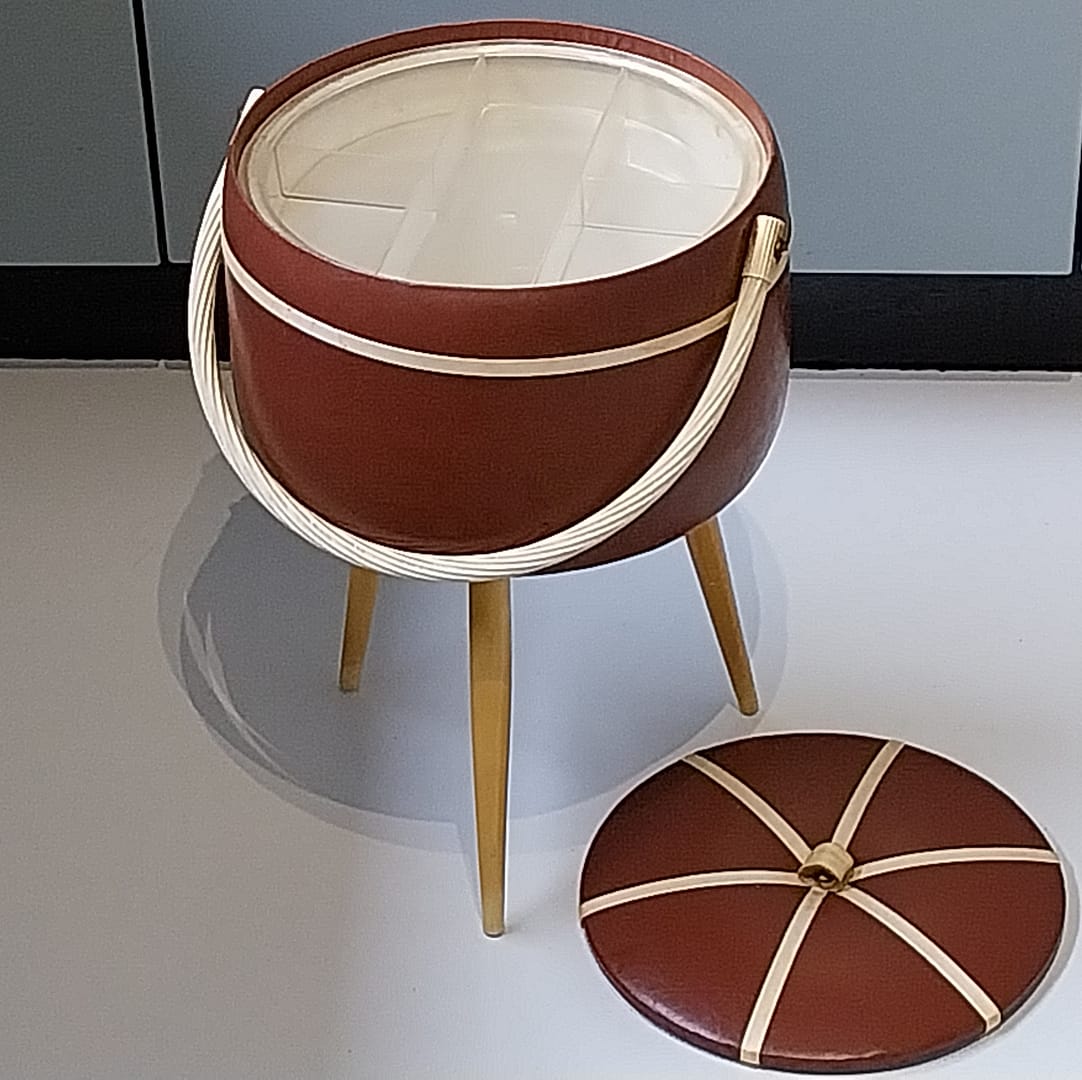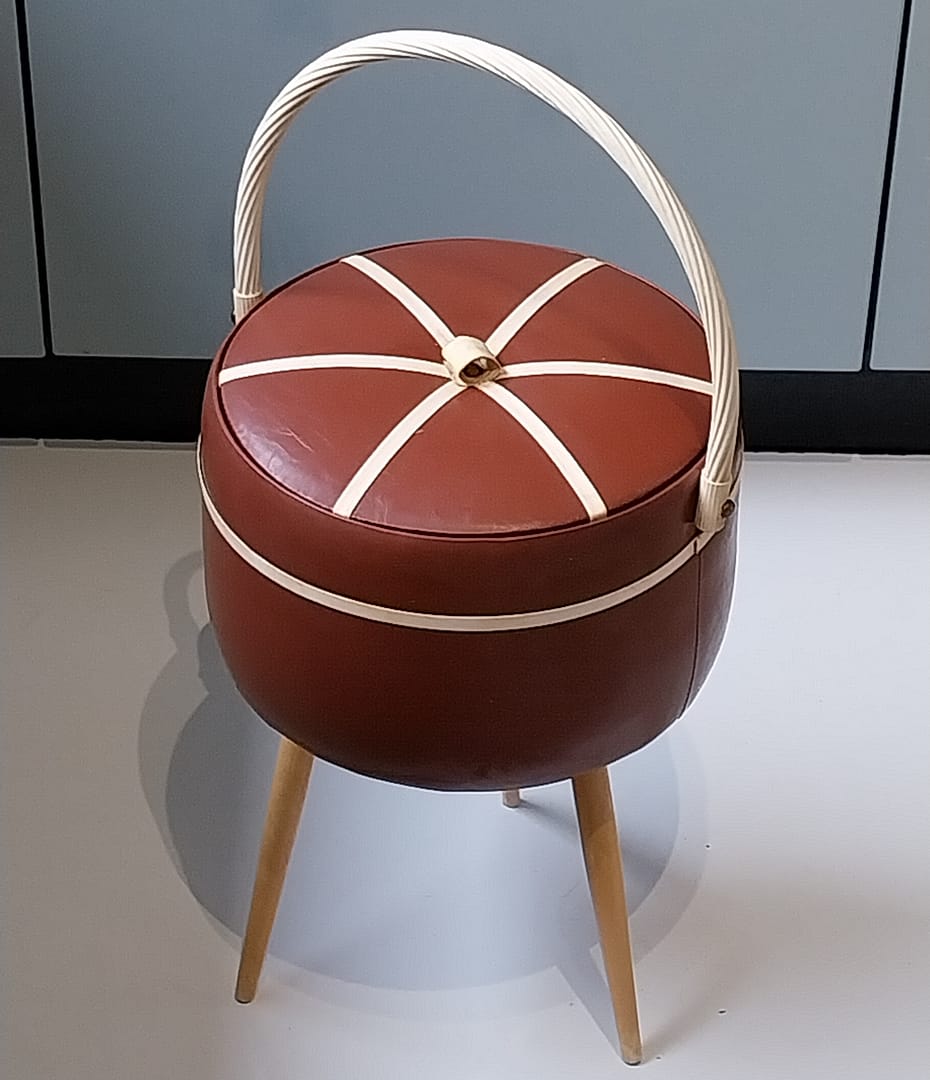 - Leuk vintage naaimandje, naaibox, opbergmandje dateert uit de jaren ’60 en staat op 3 schuine houten poten, bekleed met leer, met hengsel en in het bruin/wit gekleurd.