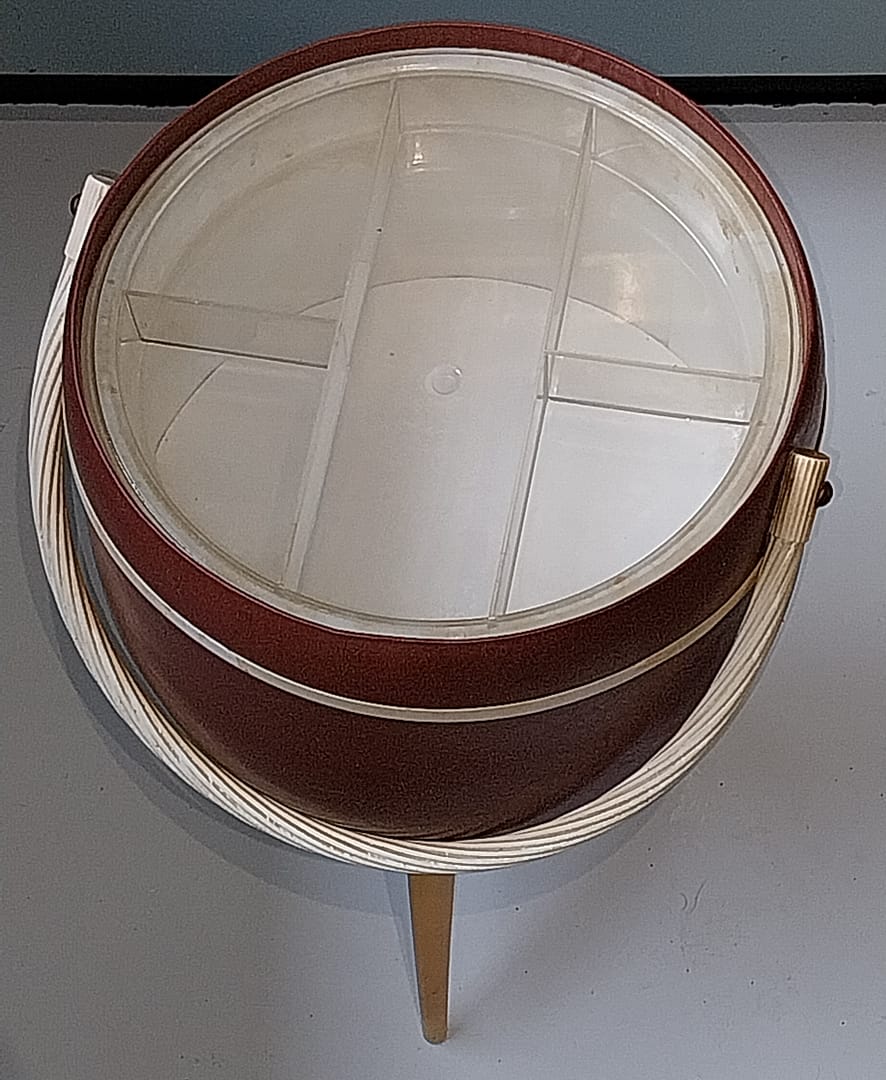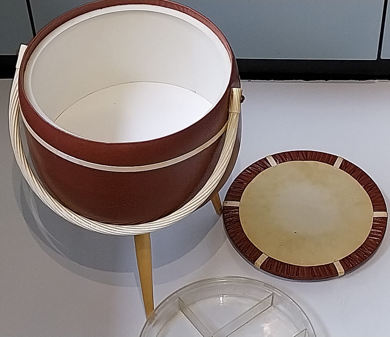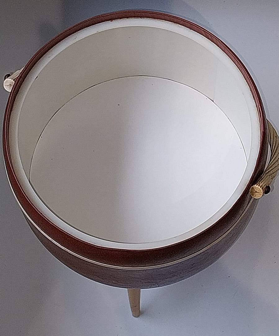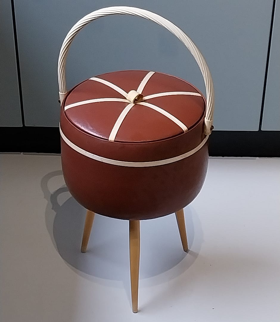 - Leuk vintage naaimandje, naaibox, opbergmandje dateert uit de jaren ’60 en staat op 3 schuine houten poten, bekleed met leer, met hengsel en in het bruin/wit gekleurd.