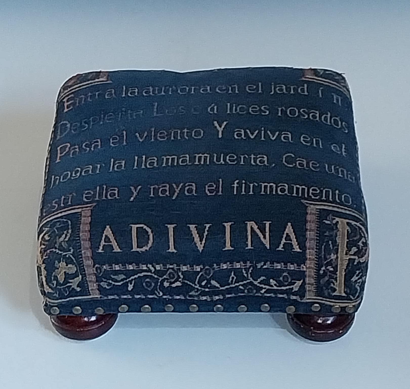 - Op de gestoffeerde bovenzijde is Spaanse tekst gedrukt, die de indruk wekt van een raadsel (“ADIVINA” betekent “raad eens”).