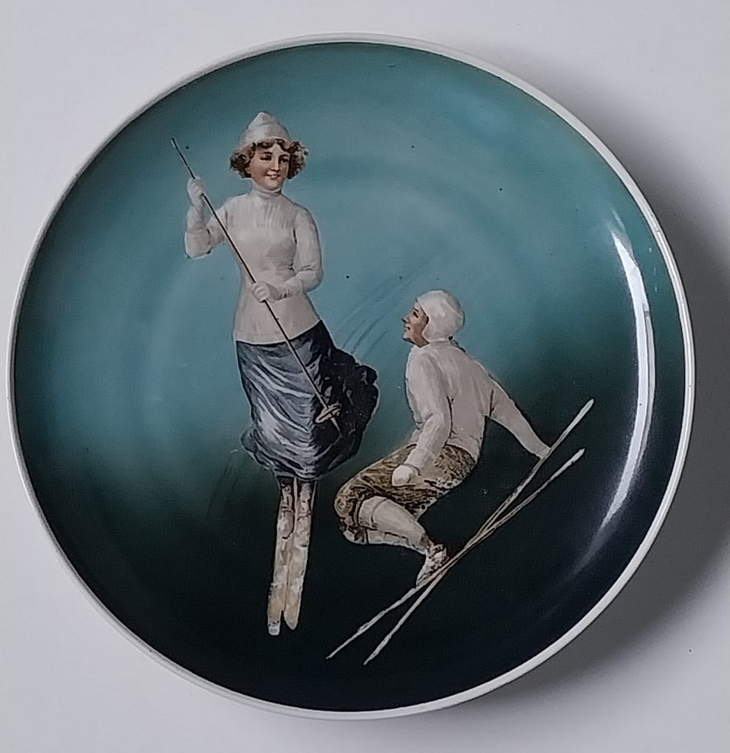 Prachtig gedecoreerd wandbord, is een antiek porseleinen wandbord met een winters tafereel van een skiënd koppel. De afbeelding op het bord toont een man en vrouw in historische skikleding, wat kenmerkend is voor de vroege 20e-eeuwse stijl.