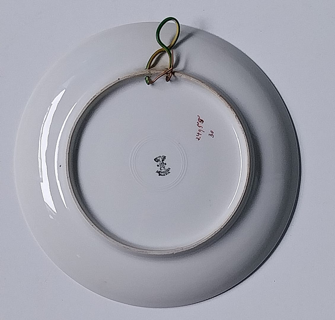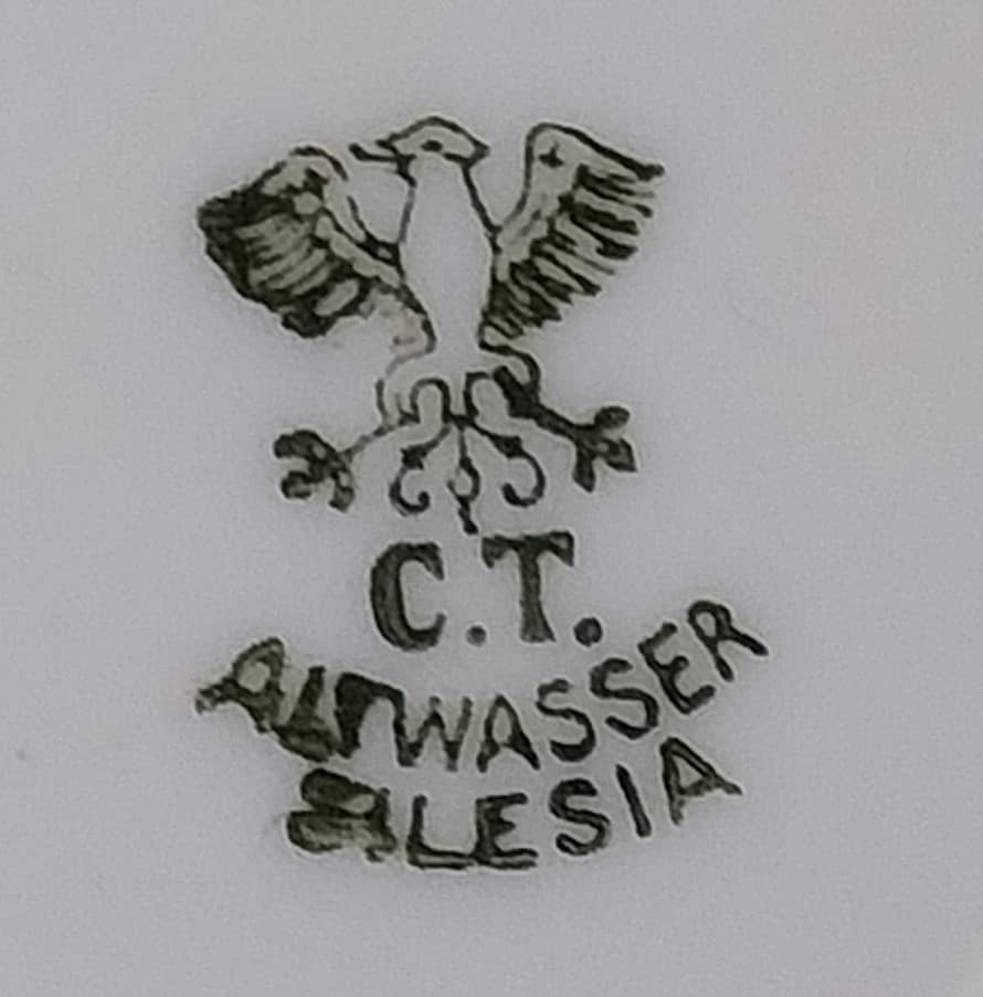 - Het merkteken aan de achterzijde van het wandbord is van de porseleinfabriek Carl Tielsch (C.T.) uit Altwasser, Silezië. Het betreft een merk dat rond 1900 werd gebruikt en de fabriek stond bekend als een van de modernste porseleinfabrieken in die periode.