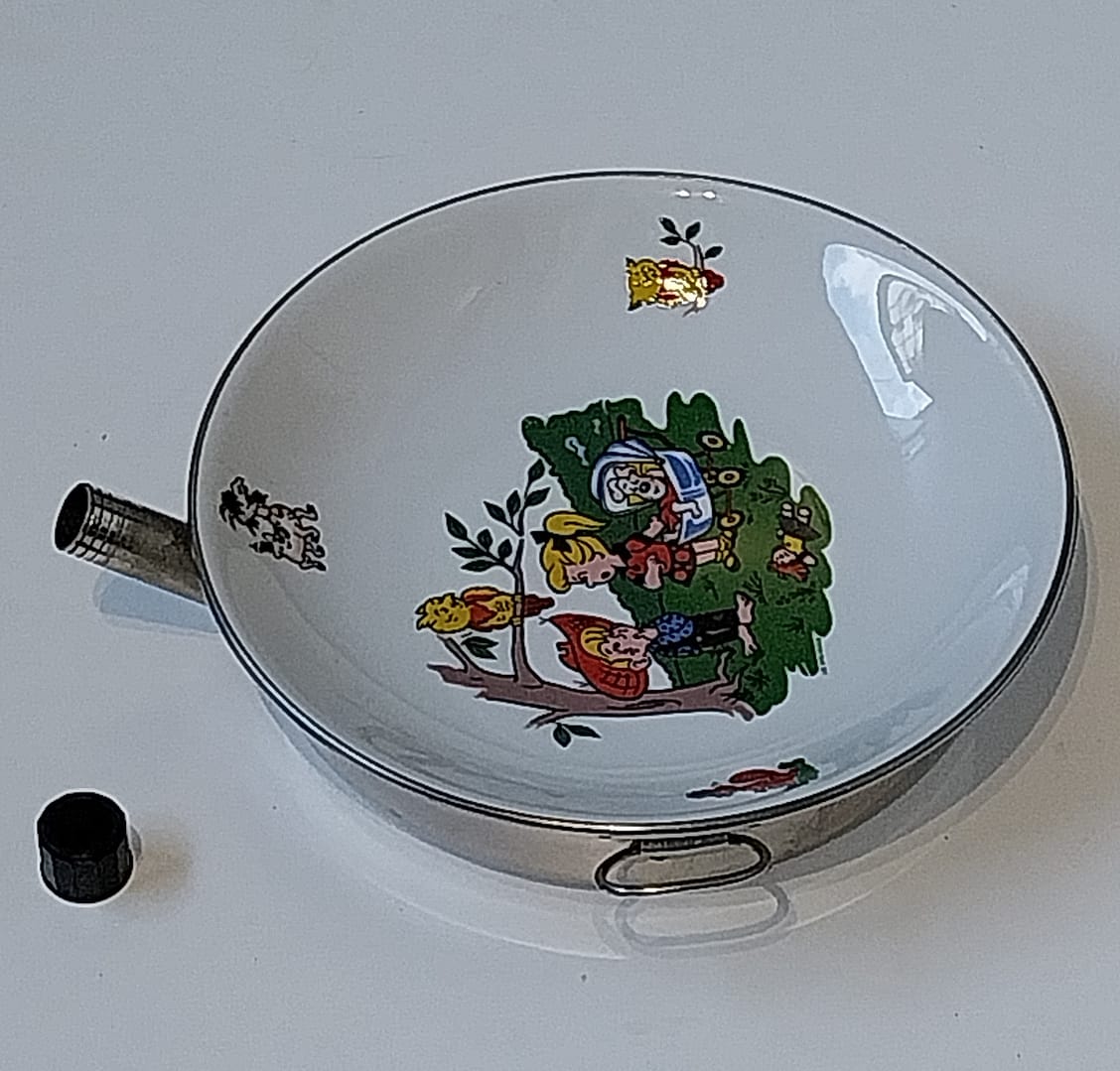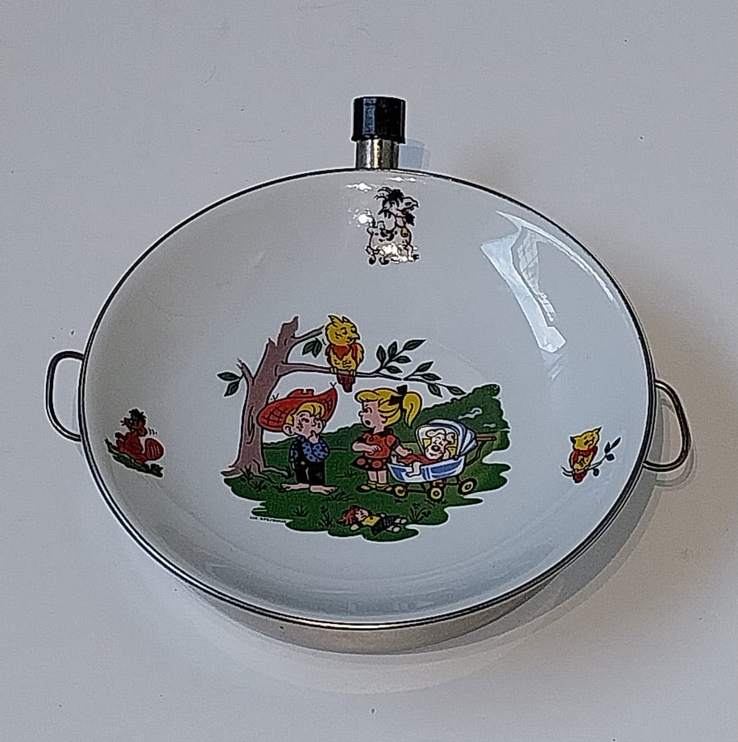 - Warmhoudbord voor langzaam etende kinderen en dateert uit de jaren ’60. Porseleinen bord ingelijst in een metalen kom met twee handgrepen en een kleine tuit met dopje om het warme water in te gieten. Het bord is versierd met een kleurrijke illustratie van kinderen en verschillende dieren.